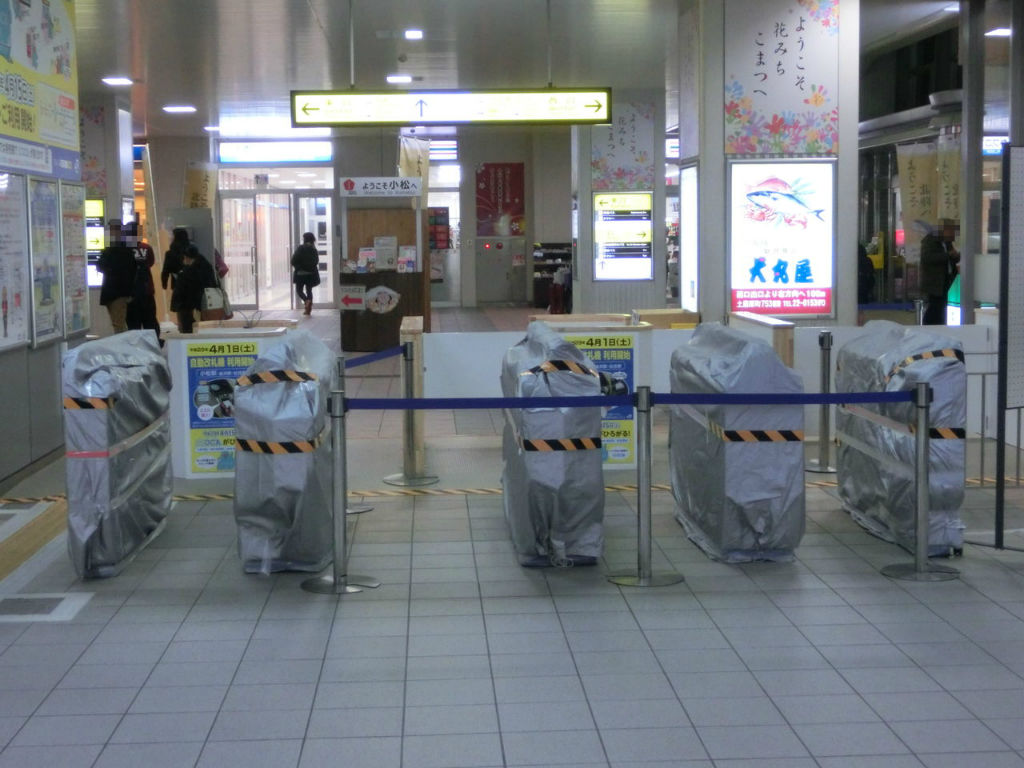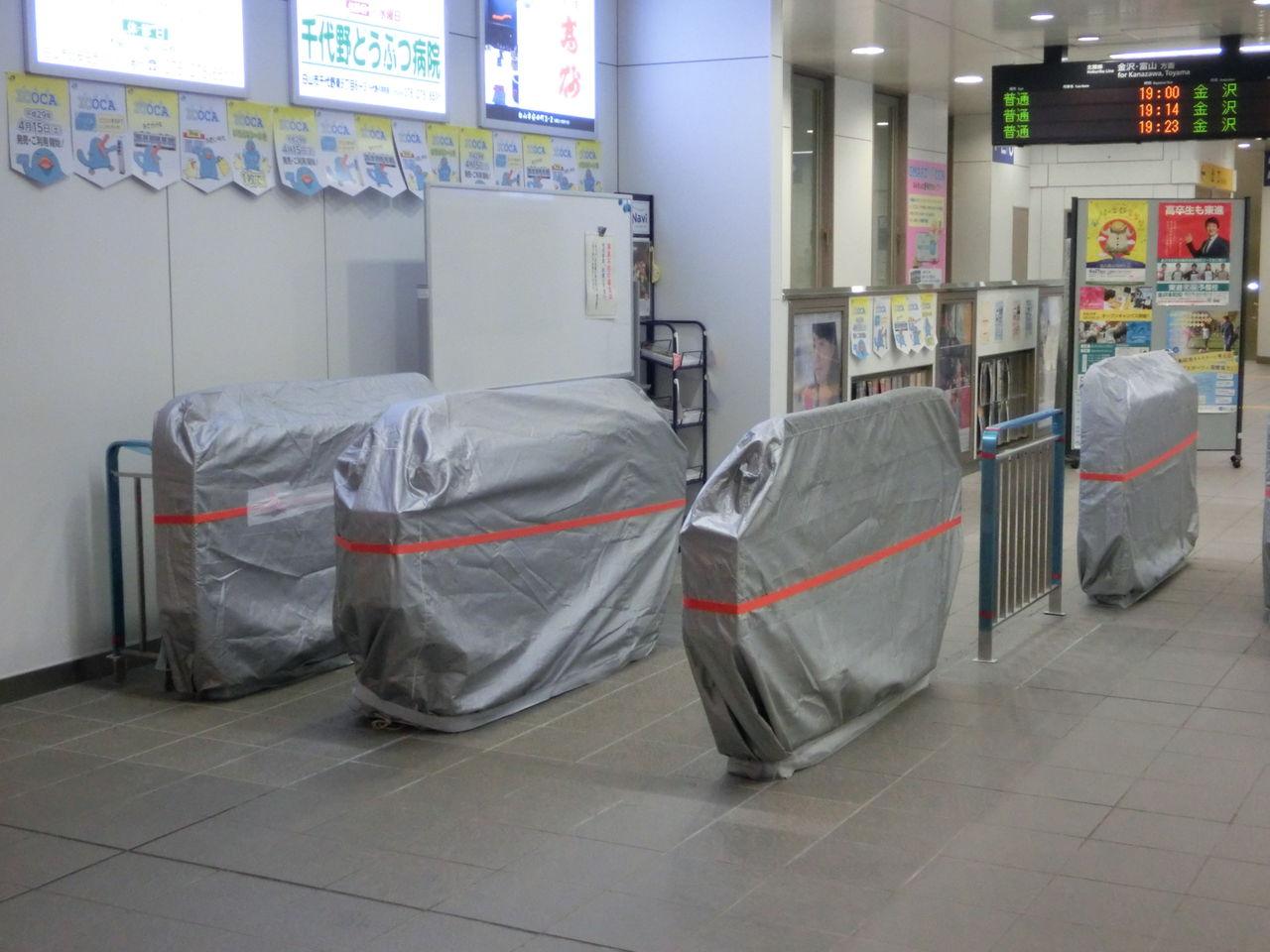 こちらも、カバーの被せられた自動改札機が設置されていました。