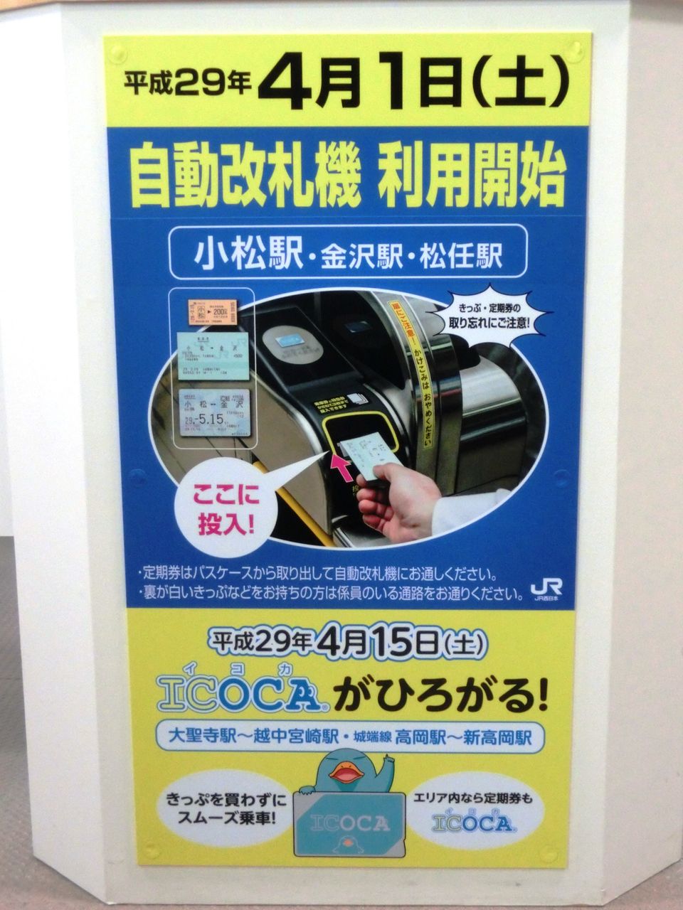 2017年1月に書いた記事 で紹介したとおり、北陸本線の大聖寺~金沢駅間の各駅と城端線の新高岡駅、IRいしかわ鉄道の駅では、2017年4月15日(土)にICOCAが導入され、ICOCAのほか SuicaやPASMOなどといった全国相互利用カードが使えるようになります。