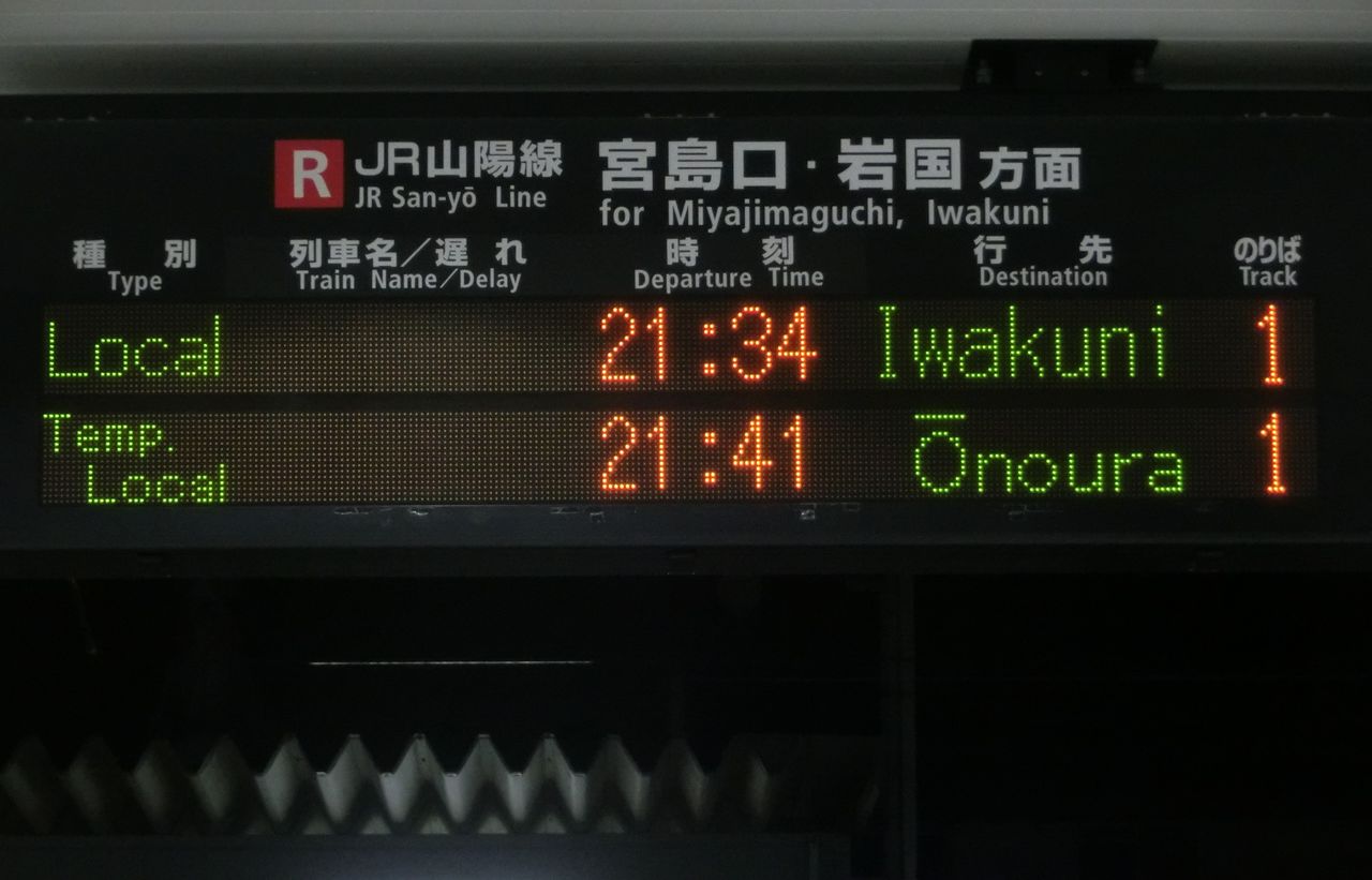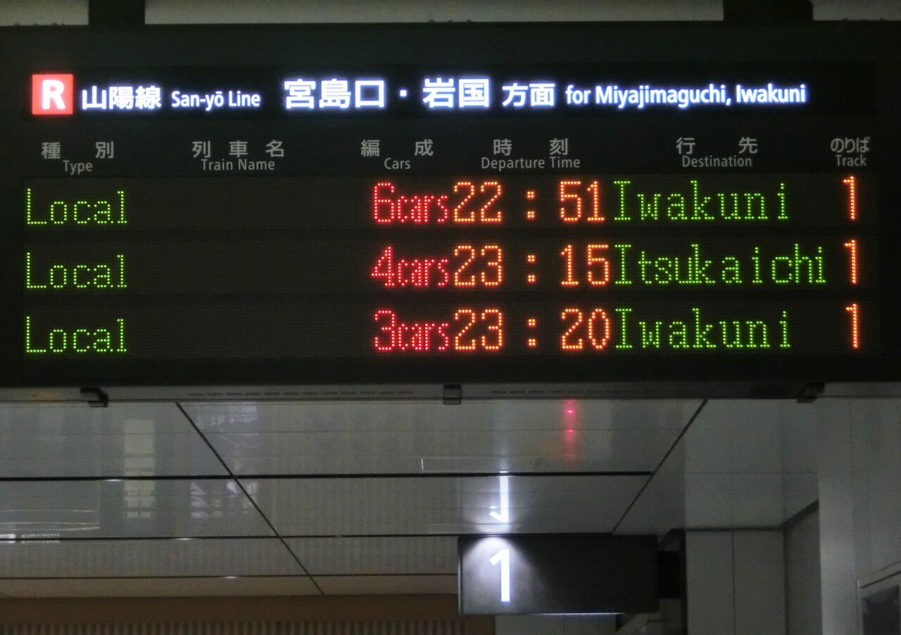 柳井行きは 最終列車でしか設定されていないレアな行き先なので、この表示が出るのは 22時51分の岩国行きだけとなっています。