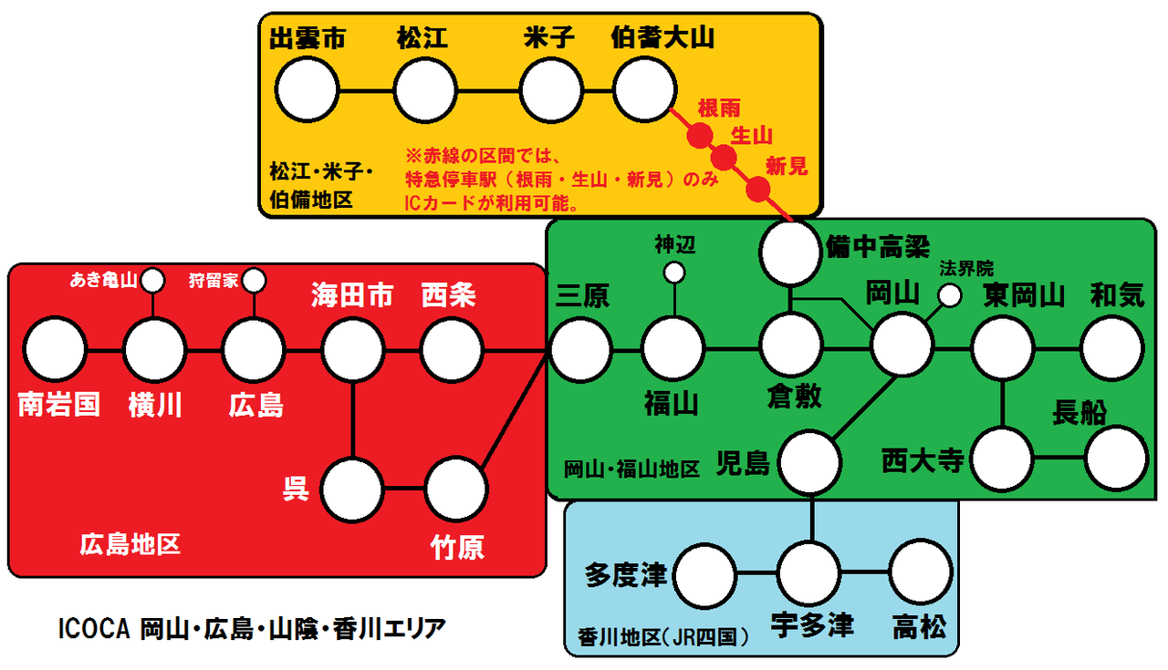 2017年現在、ICOCAの岡山・広島・山陰・香川エリアは、「岡山・福山地区」 「広島地区」 「松江・米子・伯備地区」 「香川地区」 の4つにブロック分けされており、広島地区、松江・米子・伯備地区、香川地区の駅からICカードで乗車する場合、岡山・福山地区を越えての利用ができないという制限がありますが、ICOCAエリアの一体化に伴い、このブロック分けが廃止されます。