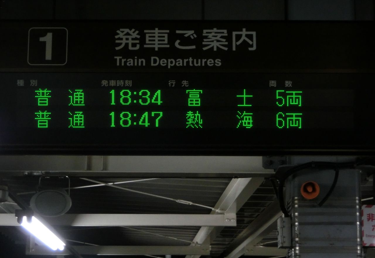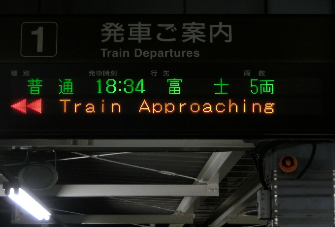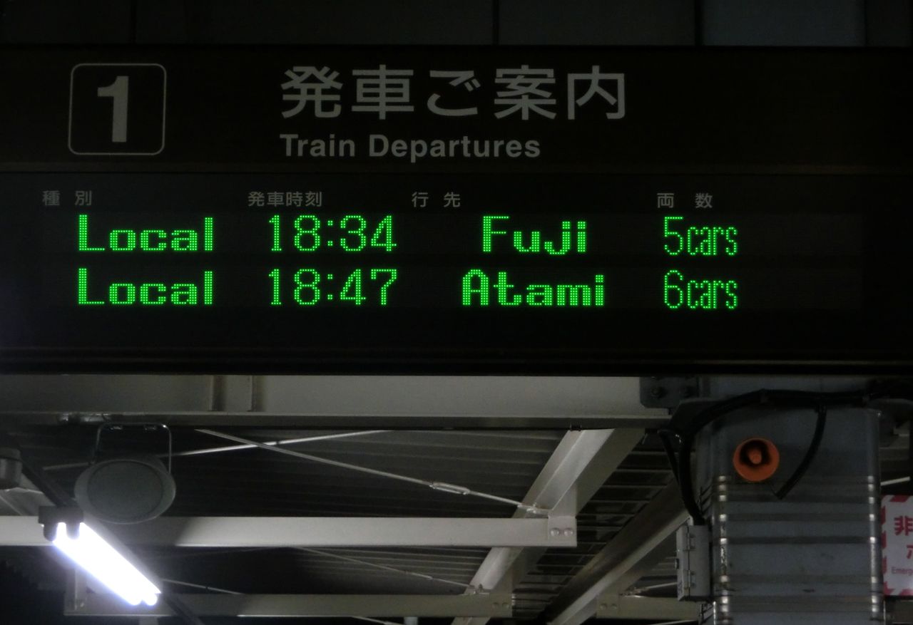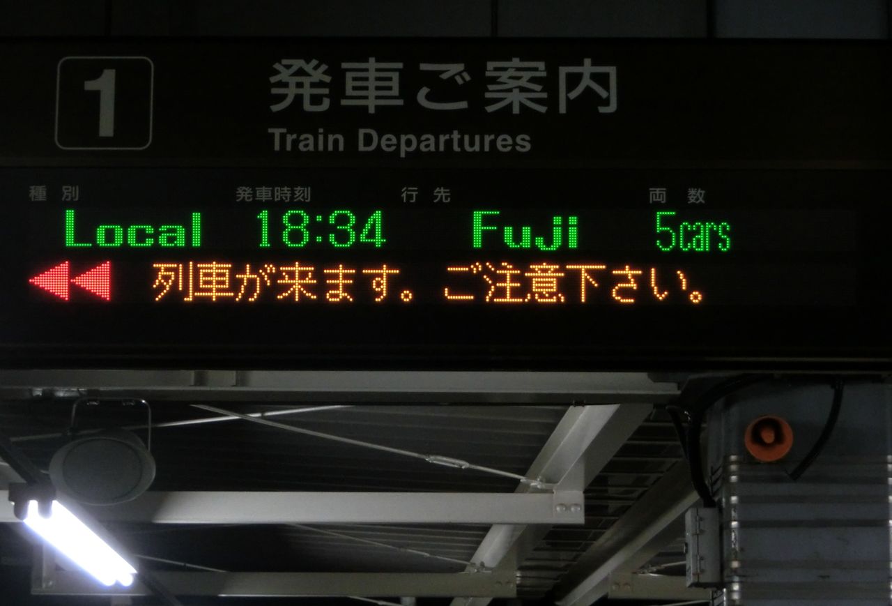 その目的は、ホームに設置されている発車標(発車標)の 「富士行き」 の表示を撮るため。