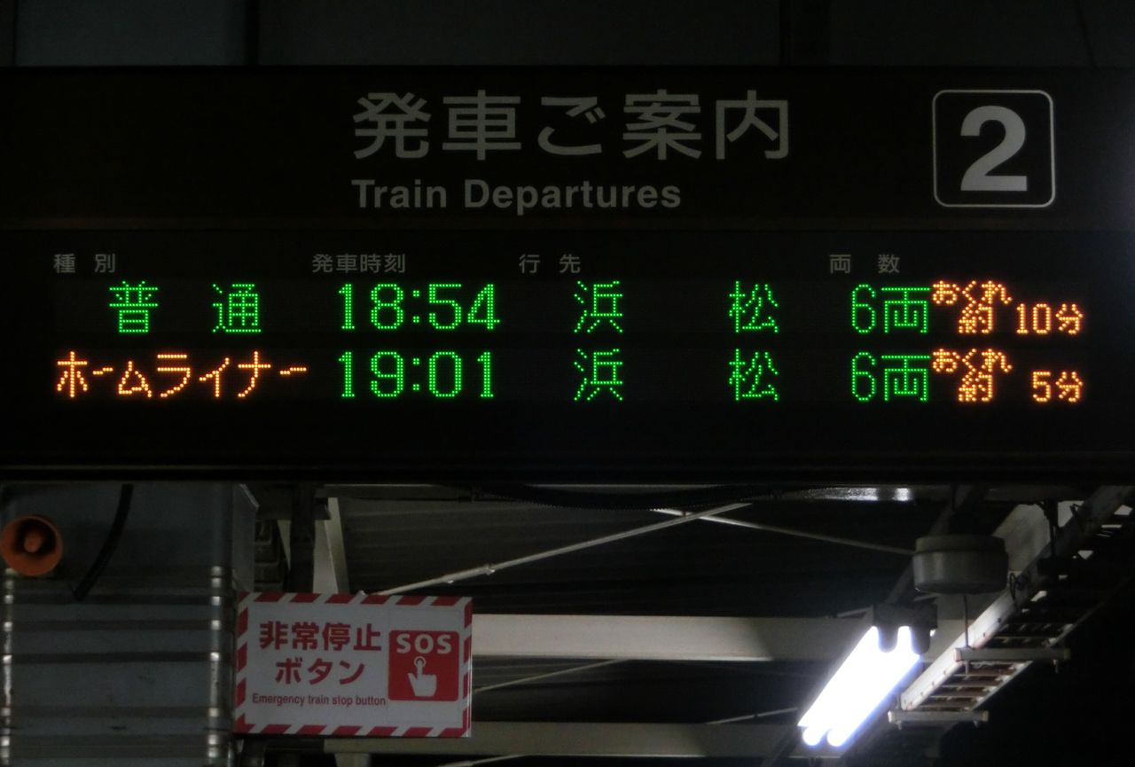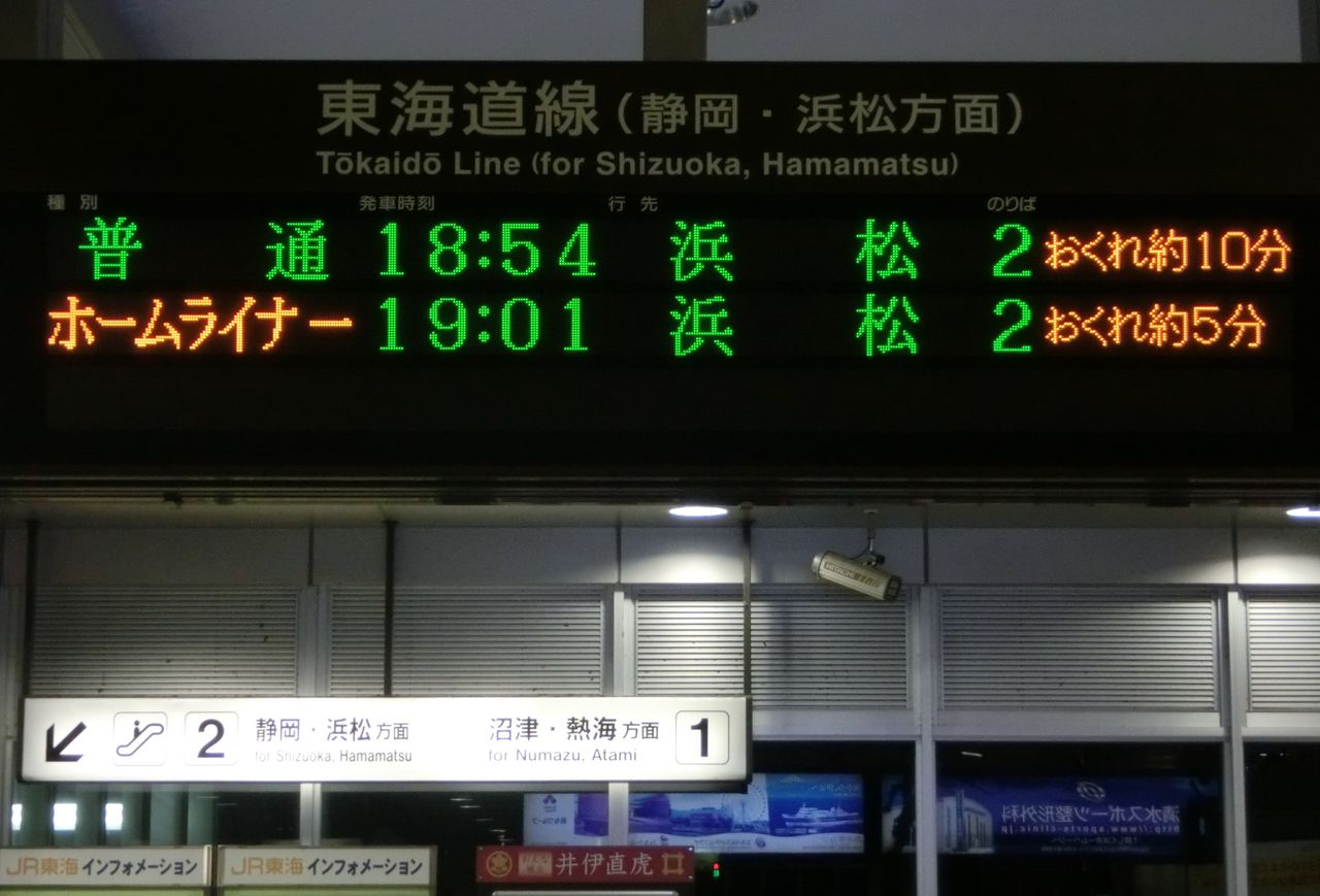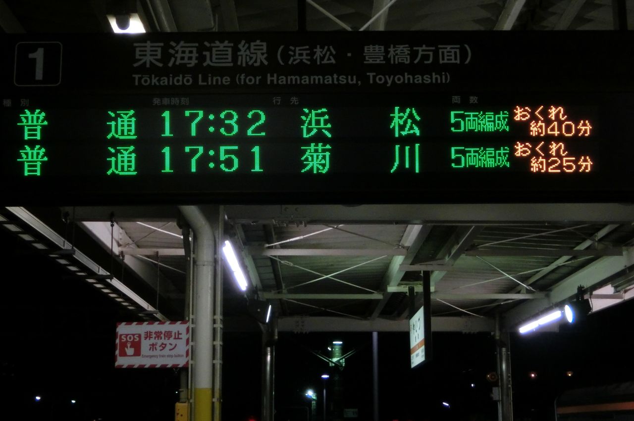 通常であれば 17時32分発の浜松行きが先に来るはずですが、35分も遅れているため、発車順が入れ替わっています。
