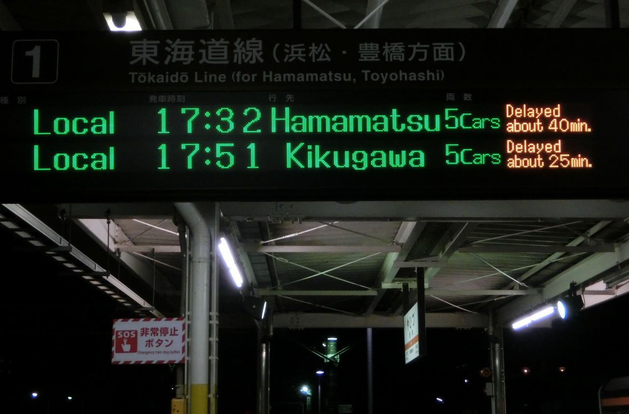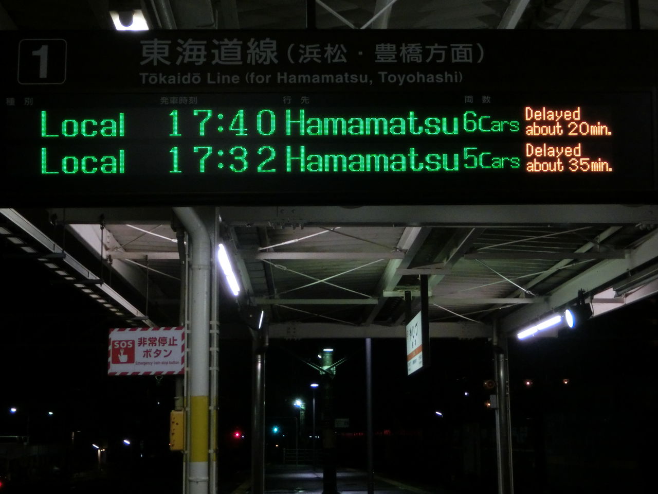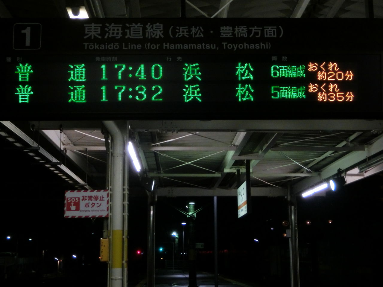通常であれば 17時32分発の浜松行きが先に来るはずですが、35分も遅れているため、発車順が入れ替わっています。