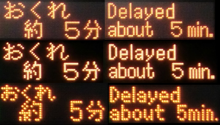 英語表示は、「Delayed about 5minute」 でした。