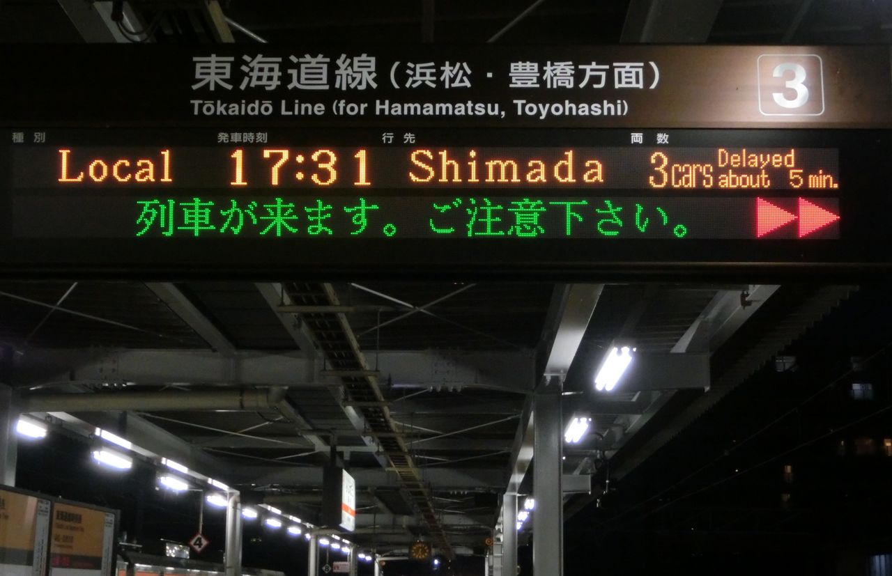 遅れ表示の出るスペースが狭いため、島田駅とは異なる表示になっています。