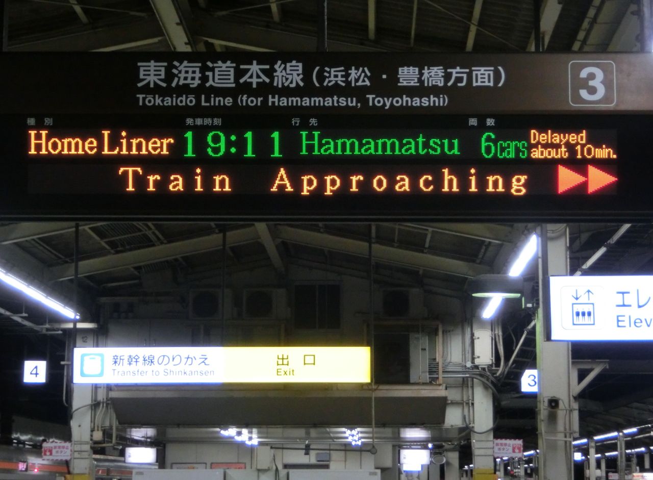 発車標の右端に 「おくれ約10分」 表示が出ています!