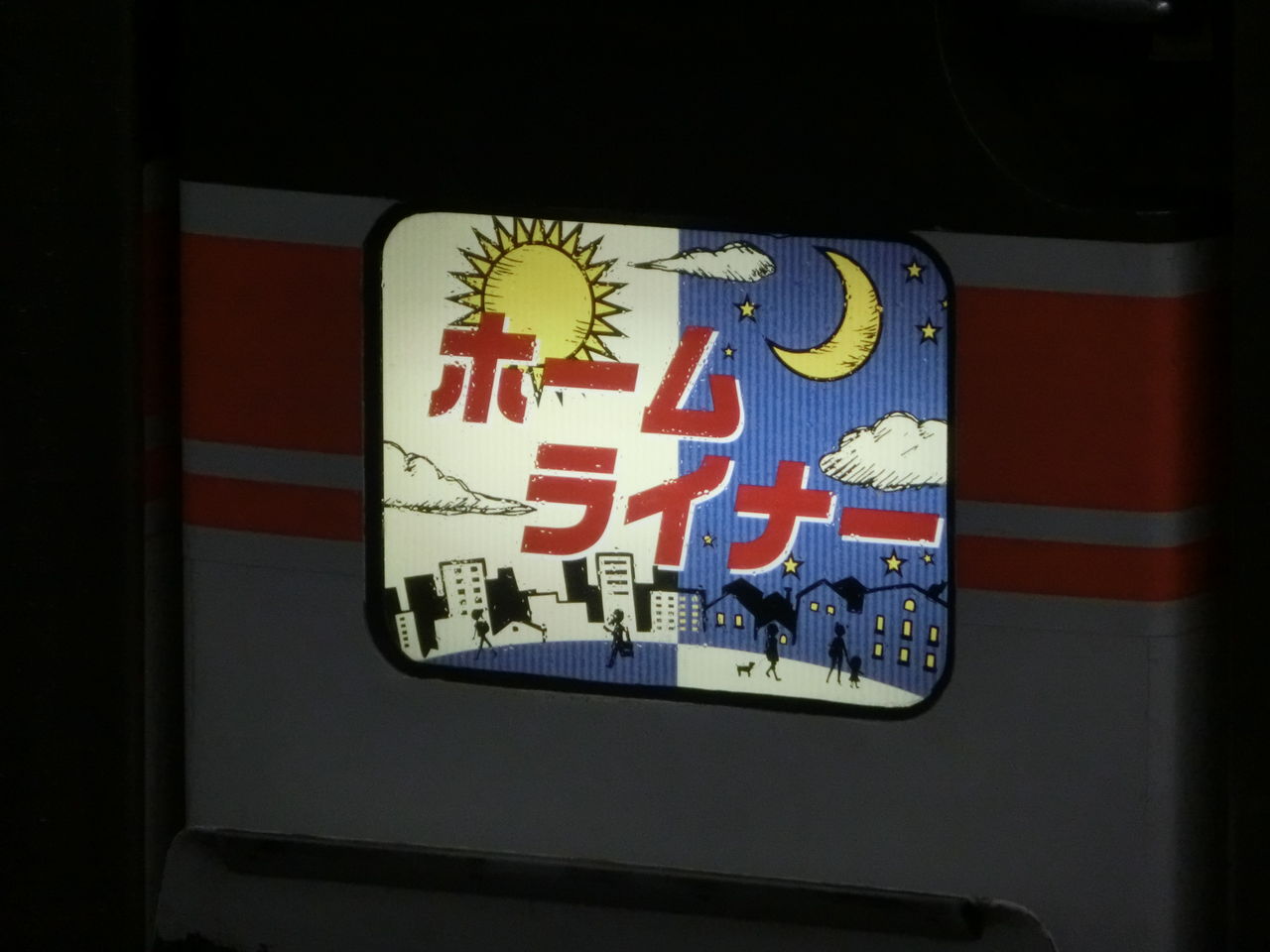 前面の種別幕を拡大して撮影。 朝と夜のイラストが描かれています。