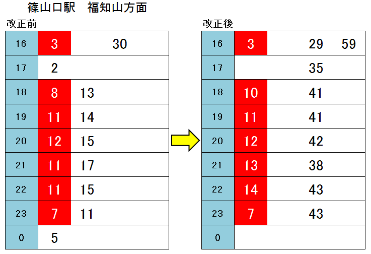 福知山駅を17時以降に発車する新大阪行きは4本→3本に削減し、運転時刻を見直し。