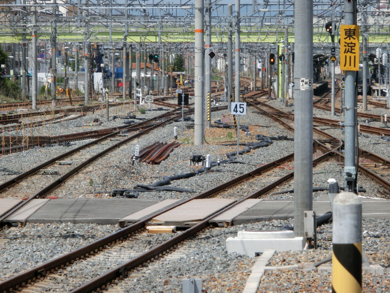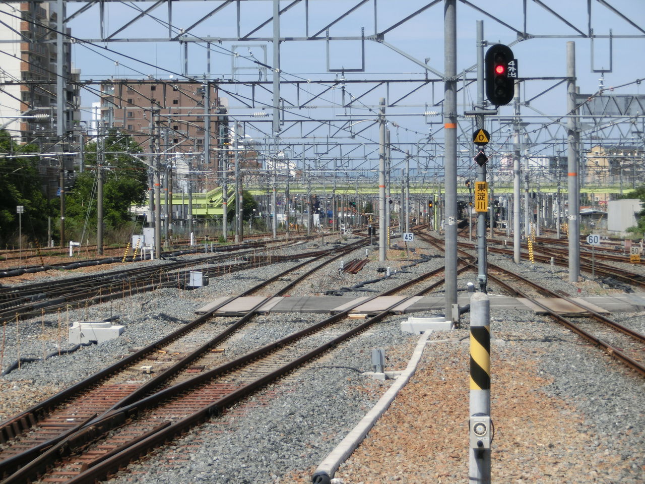 手前に、11番のりばから JR京都線の上り外側線へ出る渡り線があり、奥に 1・2番のりばから 上り外側線へ出る渡り線があります。