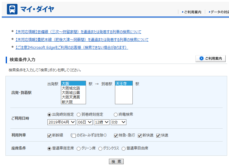 出発・到着駅が正しいかを確認して、「検索」 ボタンをクリックします。