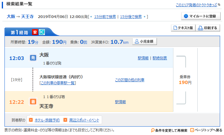 (上の画像は、出発駅を大阪駅、到着駅を天王寺駅にして検索した場合です)