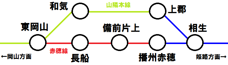 東岡山駅以遠(岡山方面)⇔相生駅以遠(姫路方面)を移動する場合、所要時間が短いのは 山陽本線 上郡駅経由ですが、乗車距離は 赤穂線経由の方が3.2km短いのです。