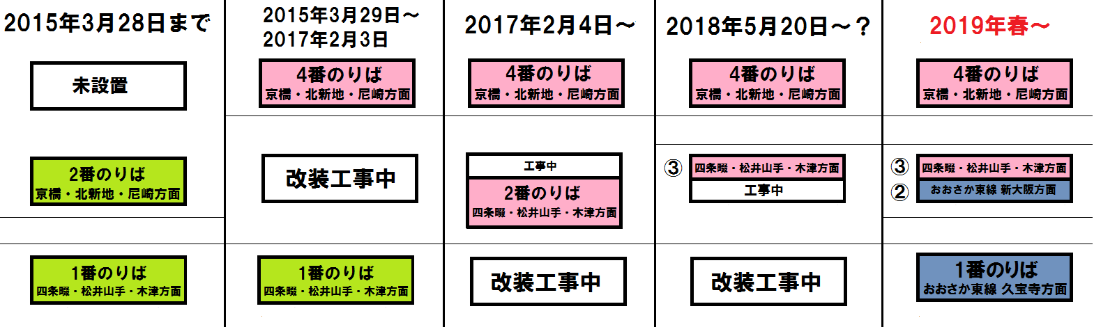 まず、2番のりばの隣に新しいホーム(4番のりば)が設置され、学研都市線の下りホームとして 2015年3月29日に使用開始されました。