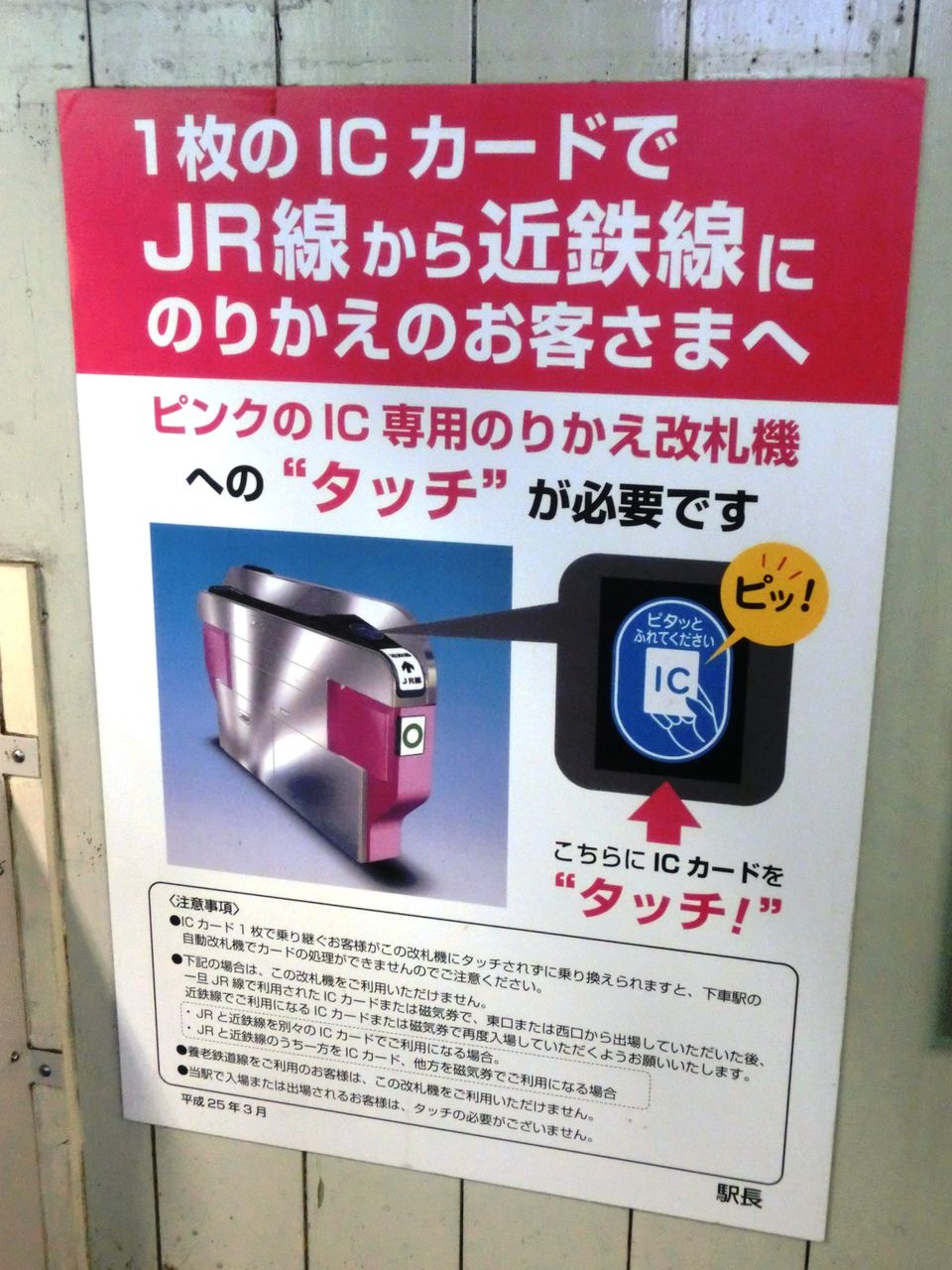 JRから近鉄に乗り換える場合、ピンク色の乗り換え改札機に ICカードをタッチする必要があります。