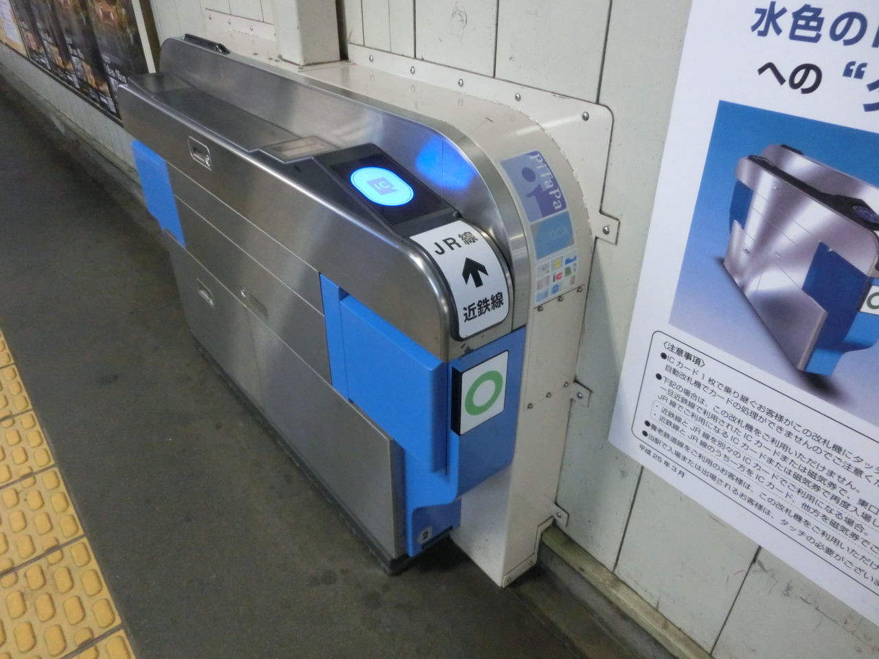 近鉄からJRに乗り換える場合は、水色の乗り換え改札機に ICカードをタッチする必要があります。