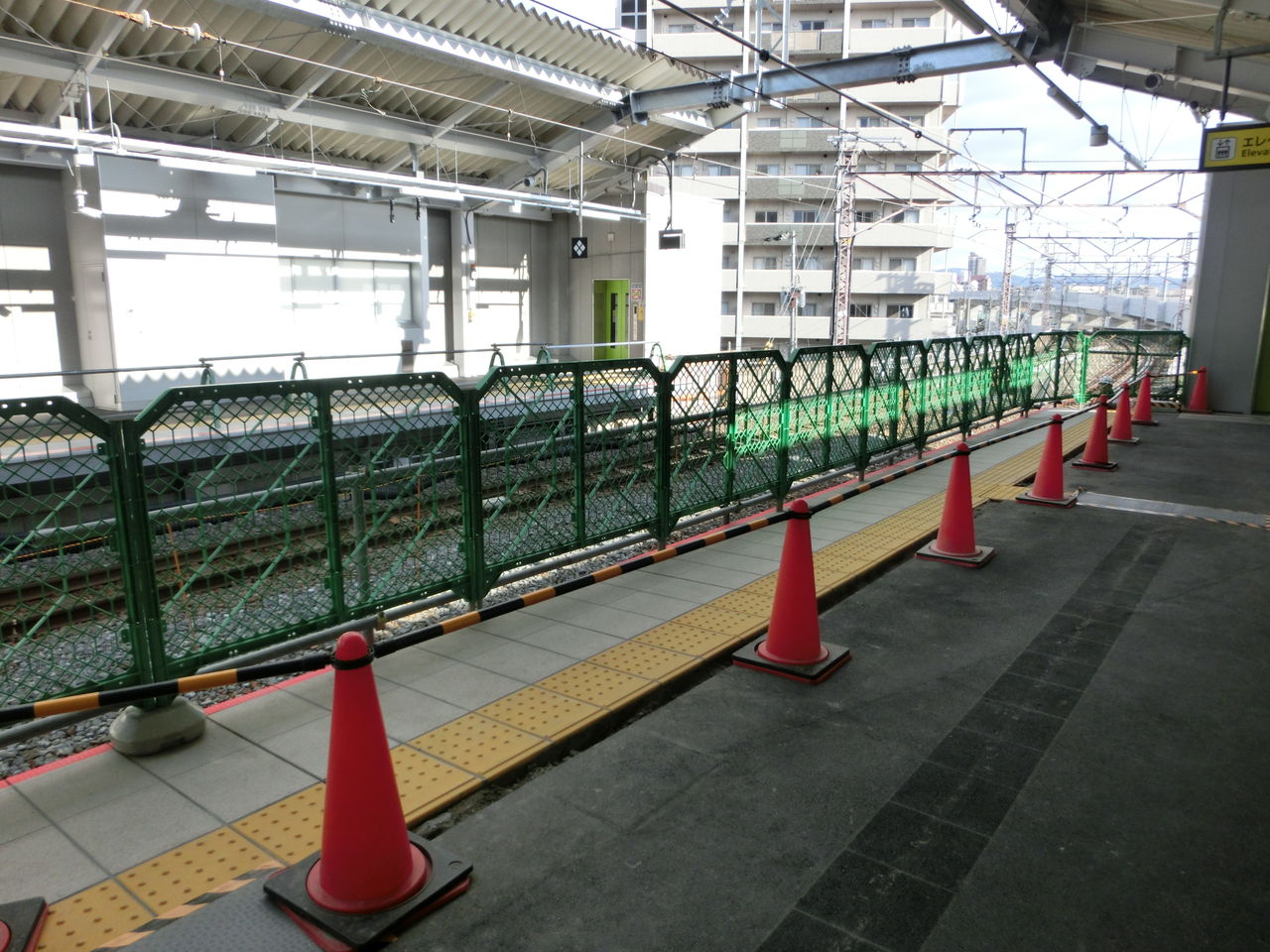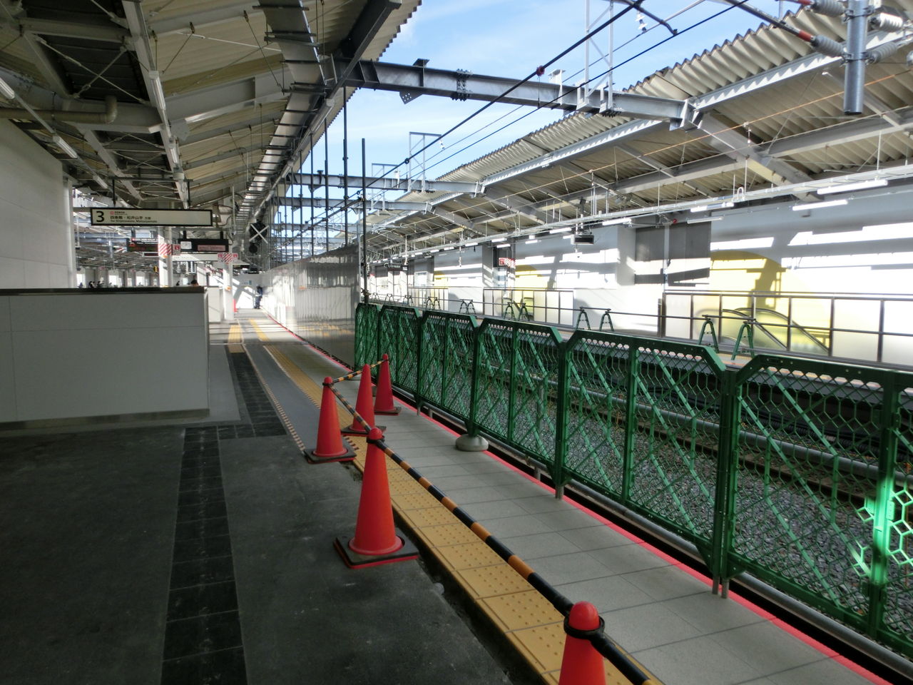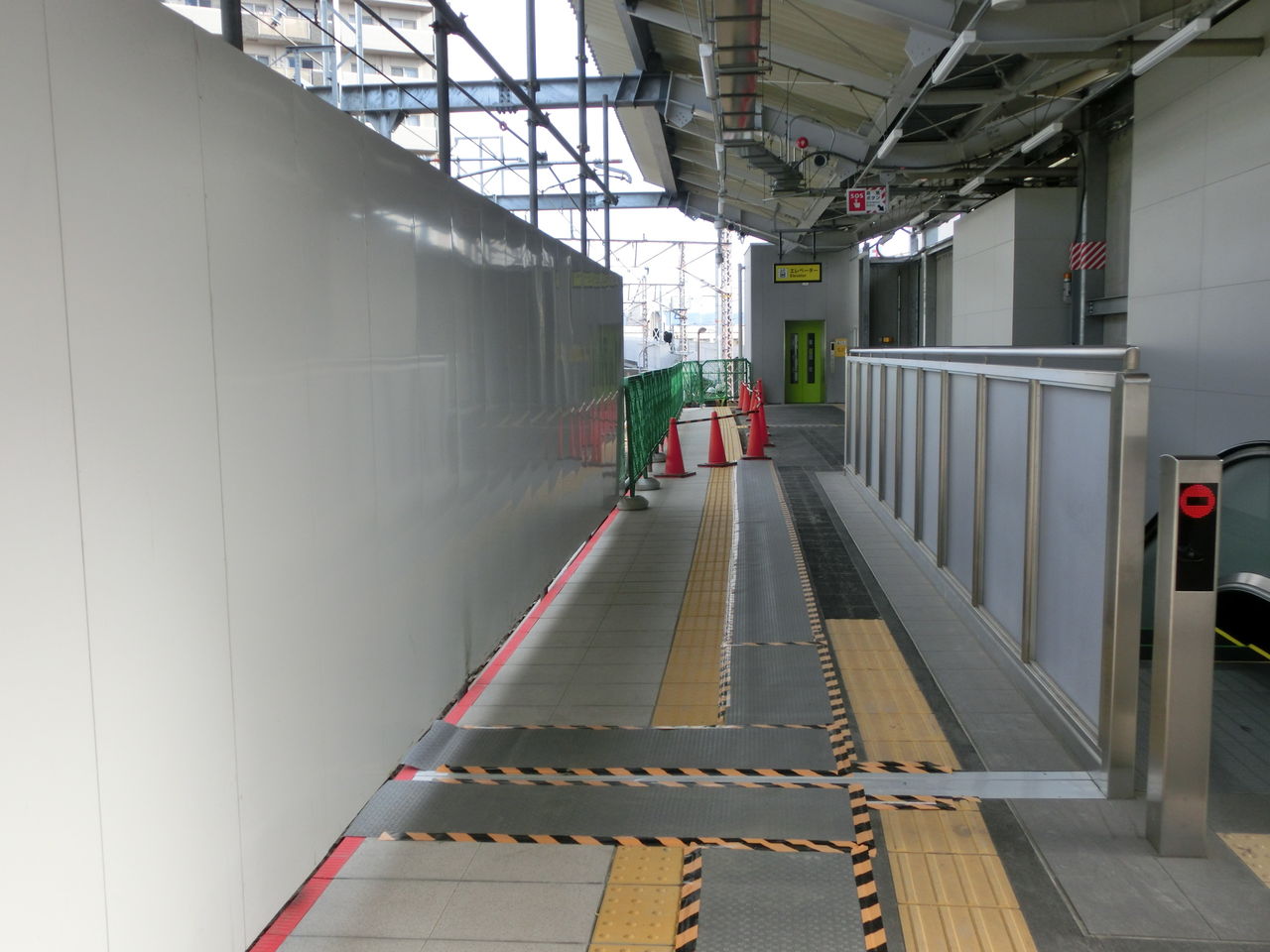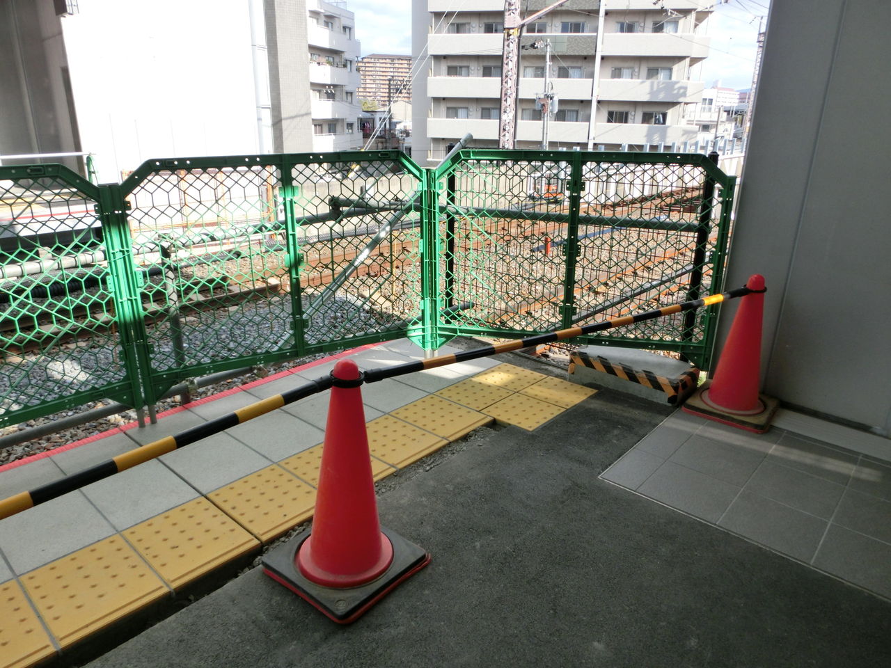 ホーム端にあった黒いフェンスが撤去され、仮設の緑色の柵が設置されました。