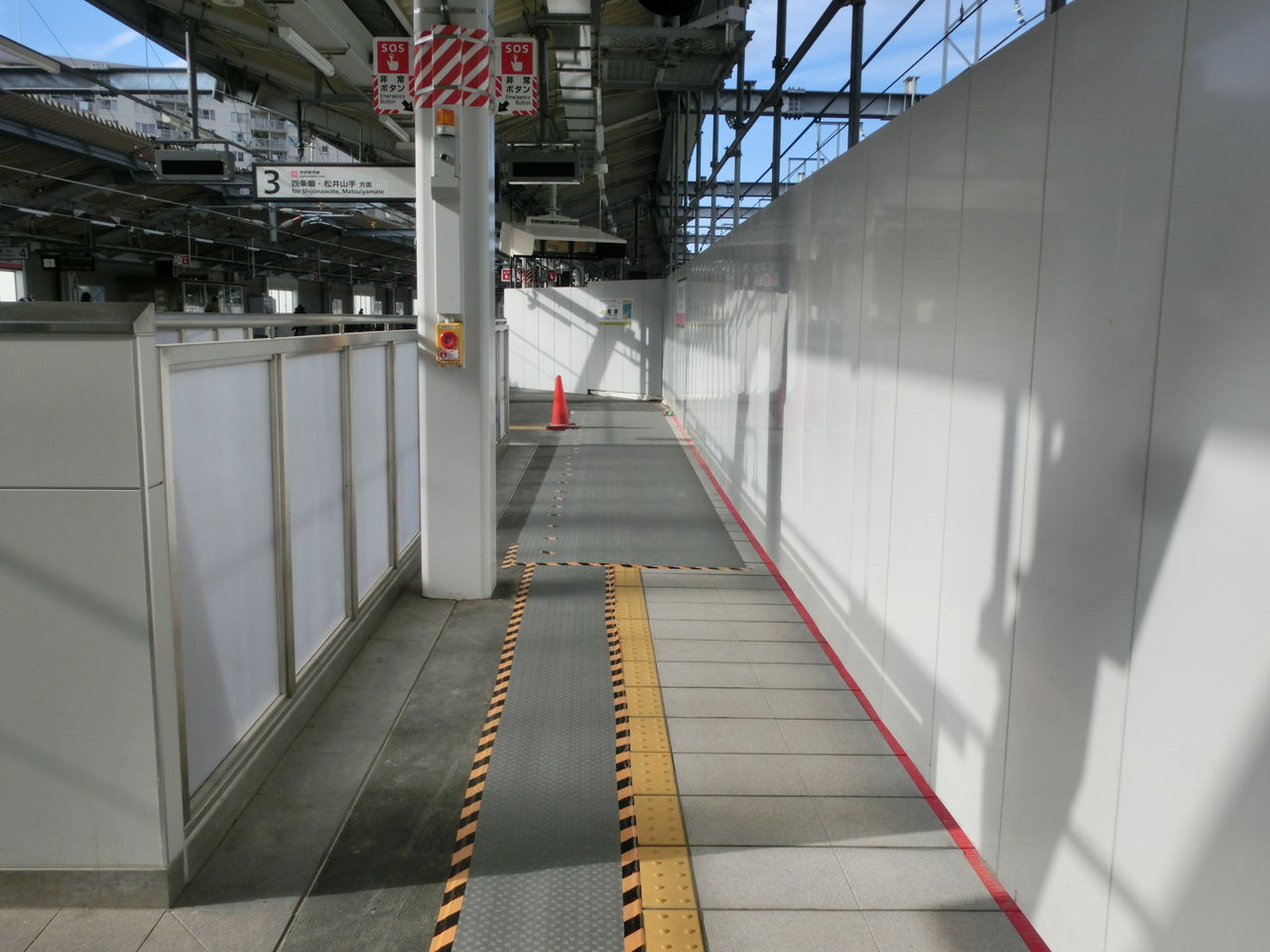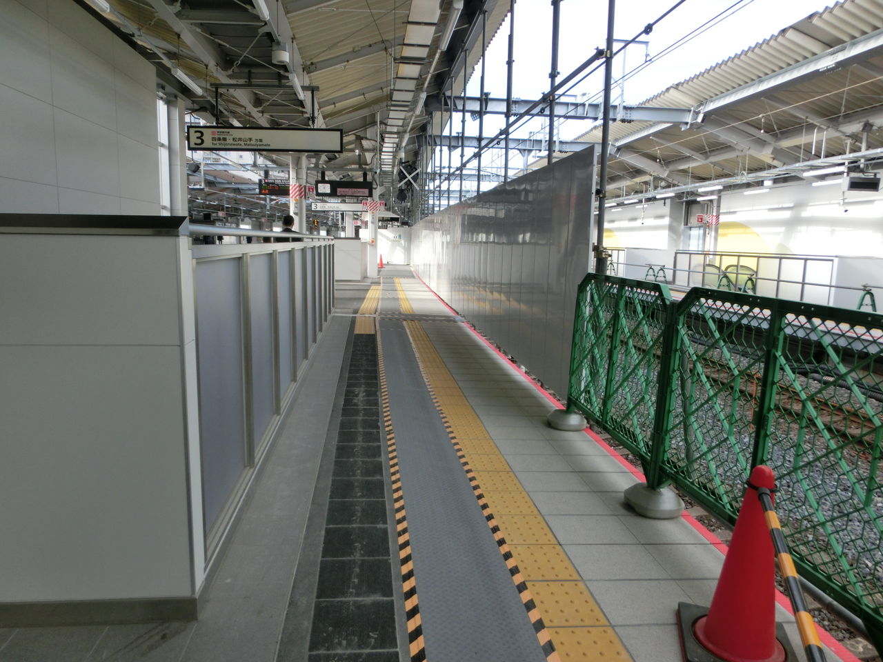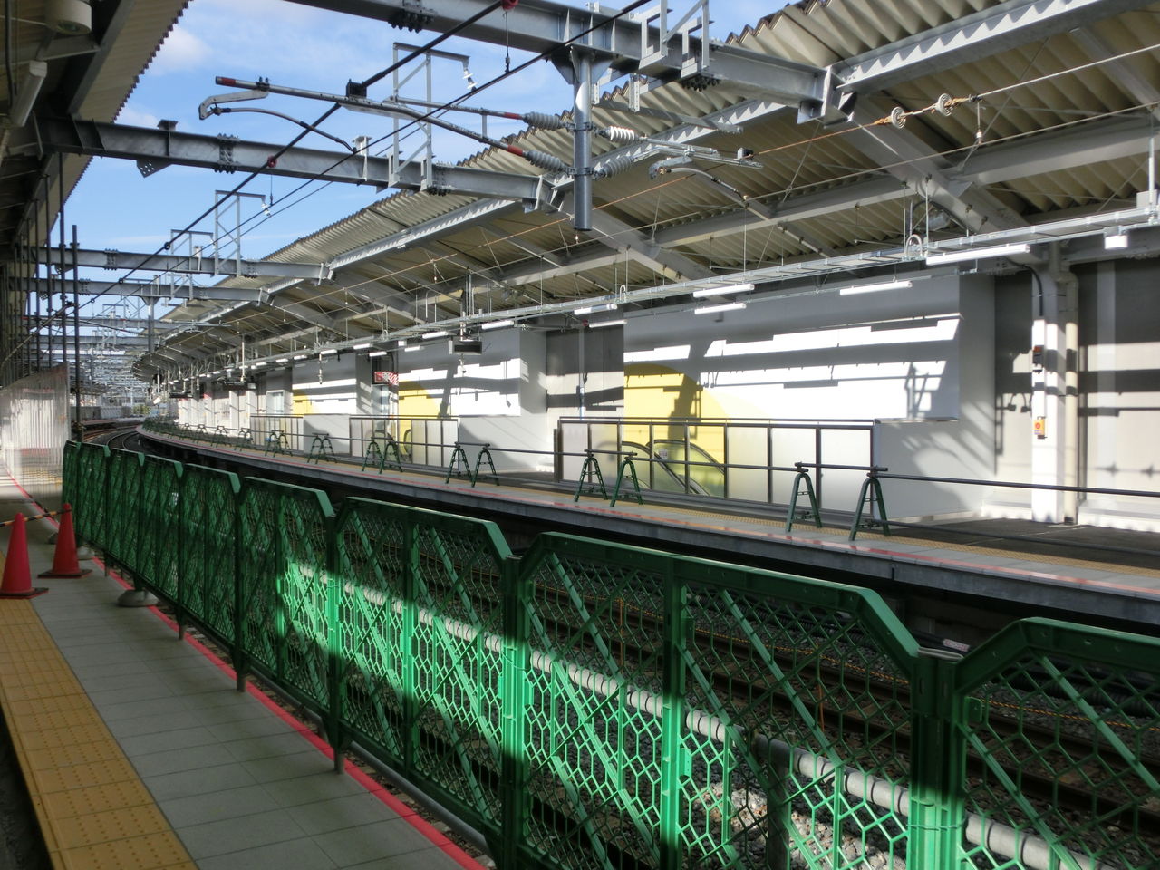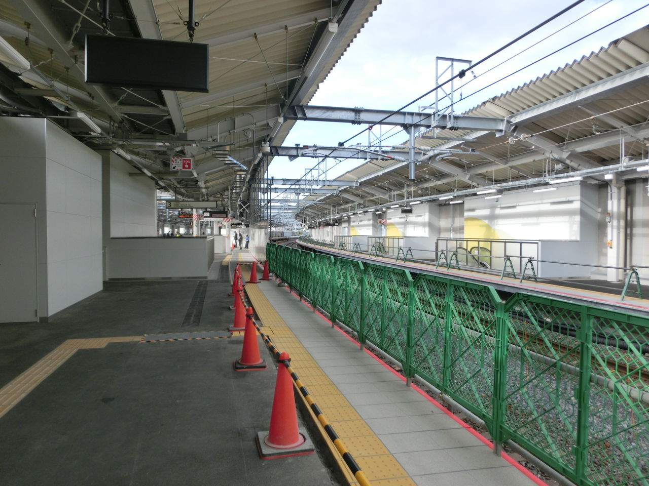 ホーム端にあった黒いフェンスが撤去され、仮設の緑色の柵が設置されました。
