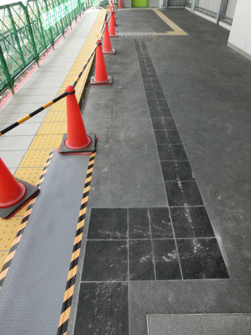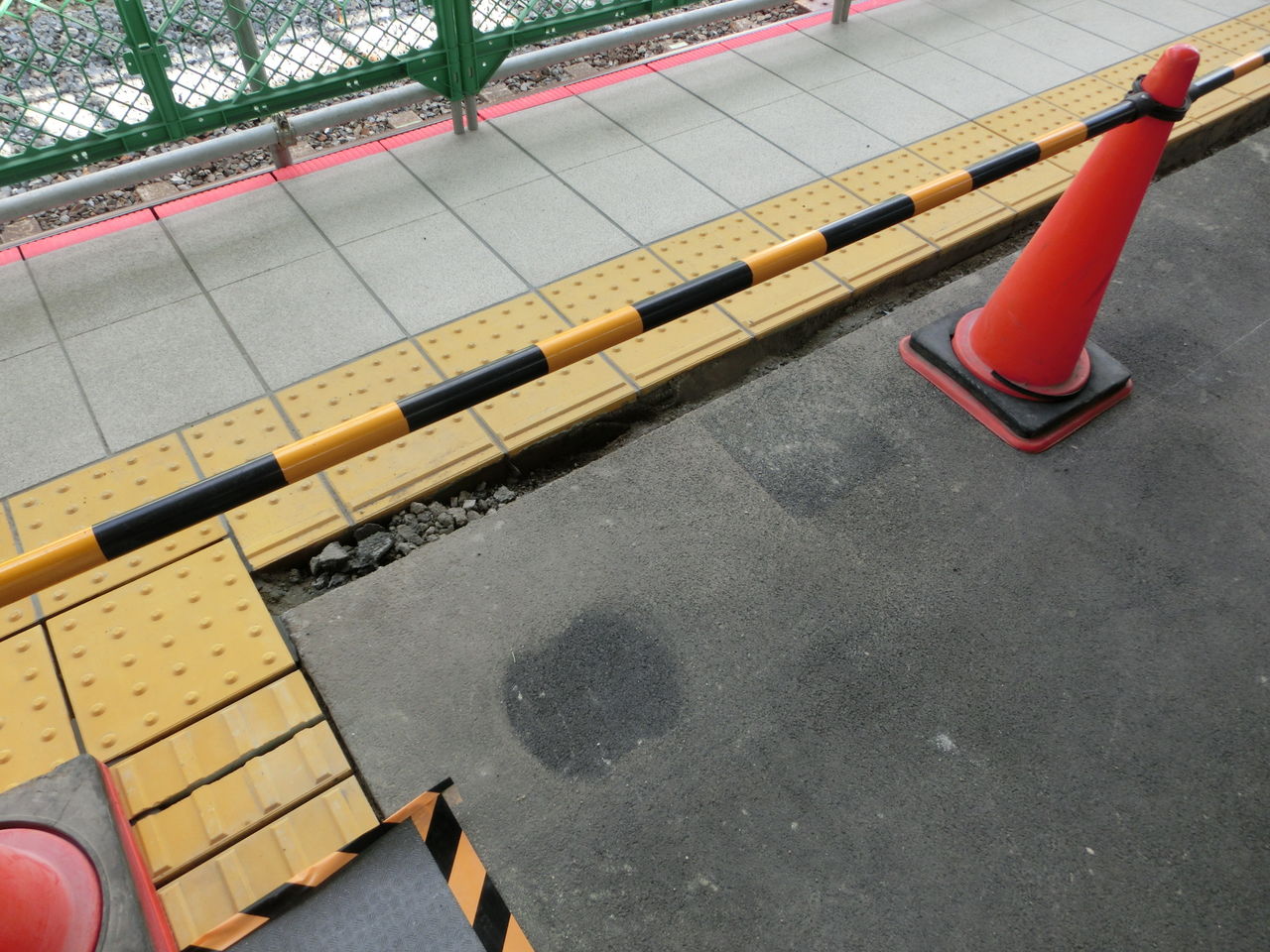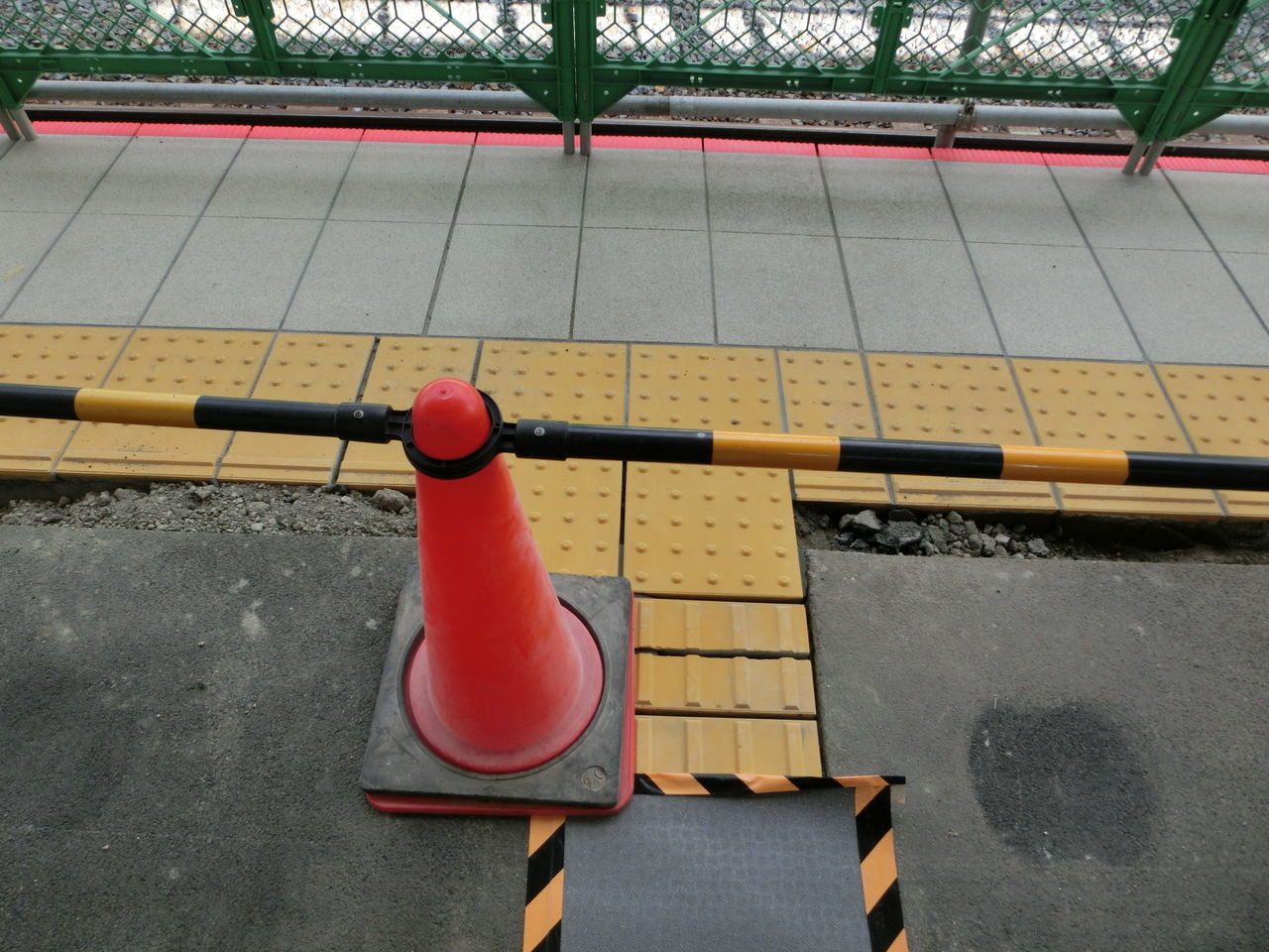 新しい点字ブロックの手前に 赤いコーンが立てられ、バーで仕切られています。
