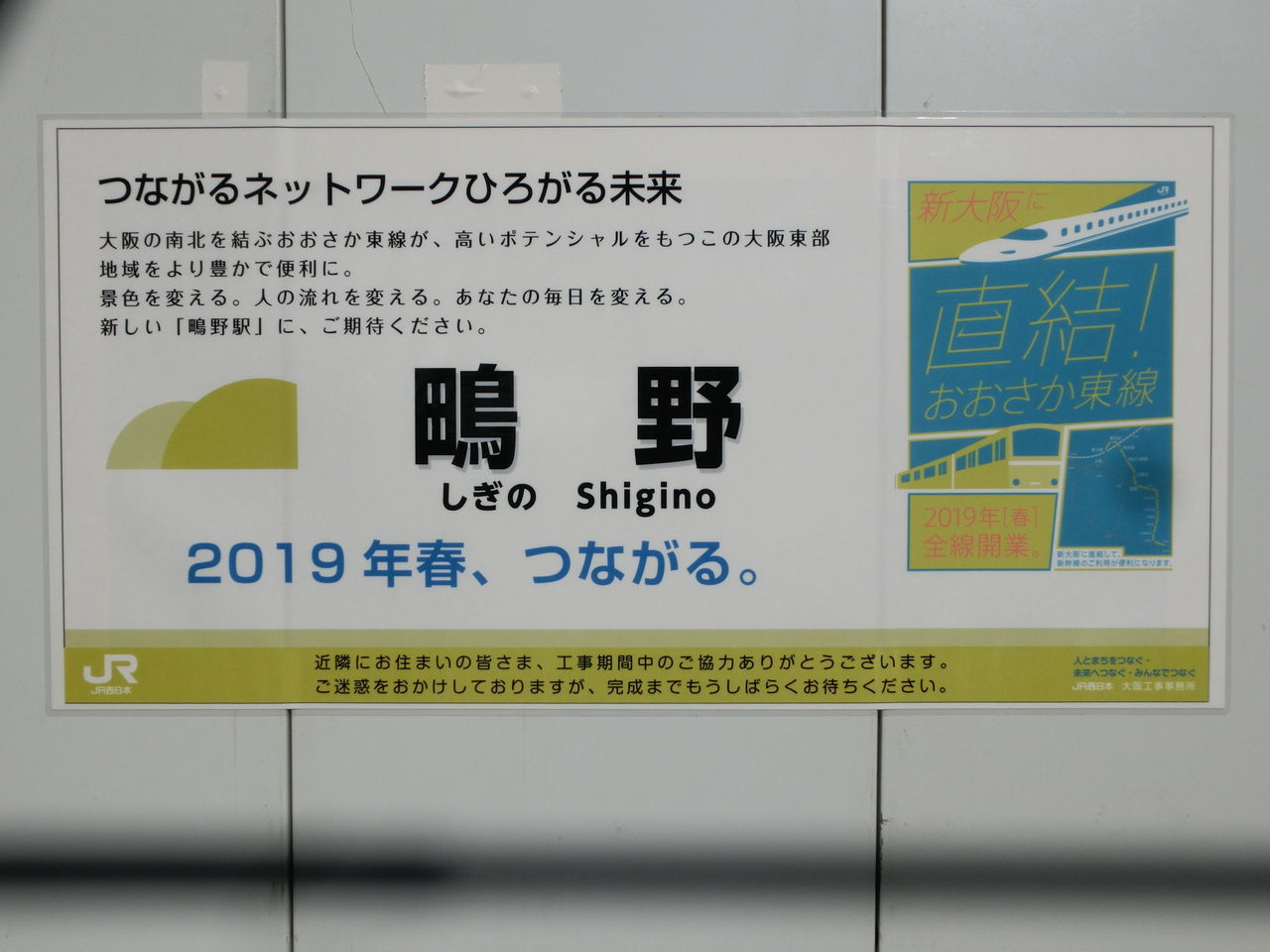 仮設の白い壁には、おおさか東線のPR看板が貼ってありました。