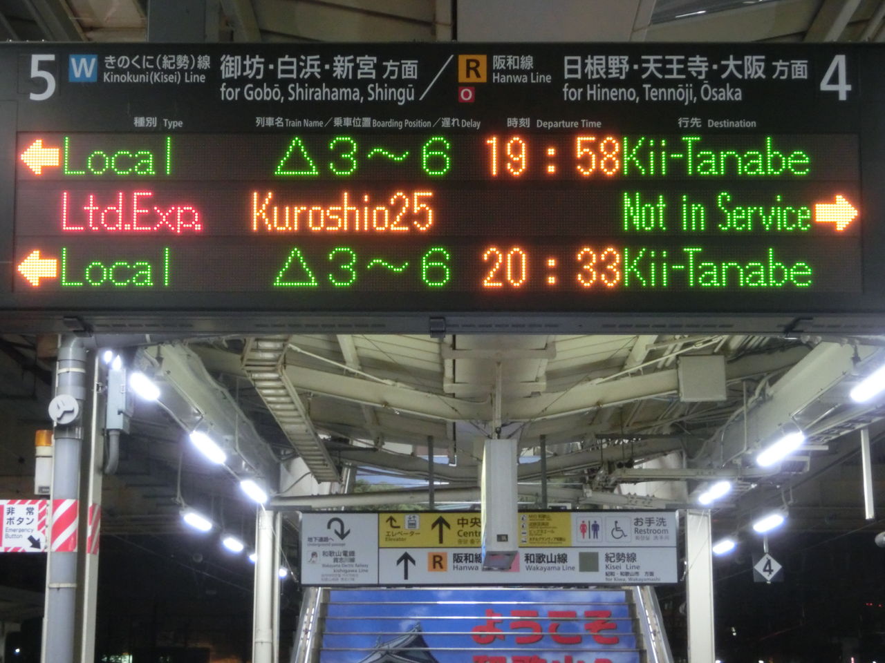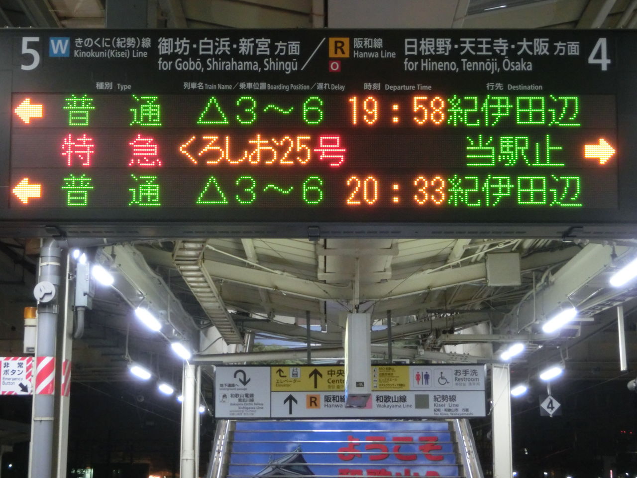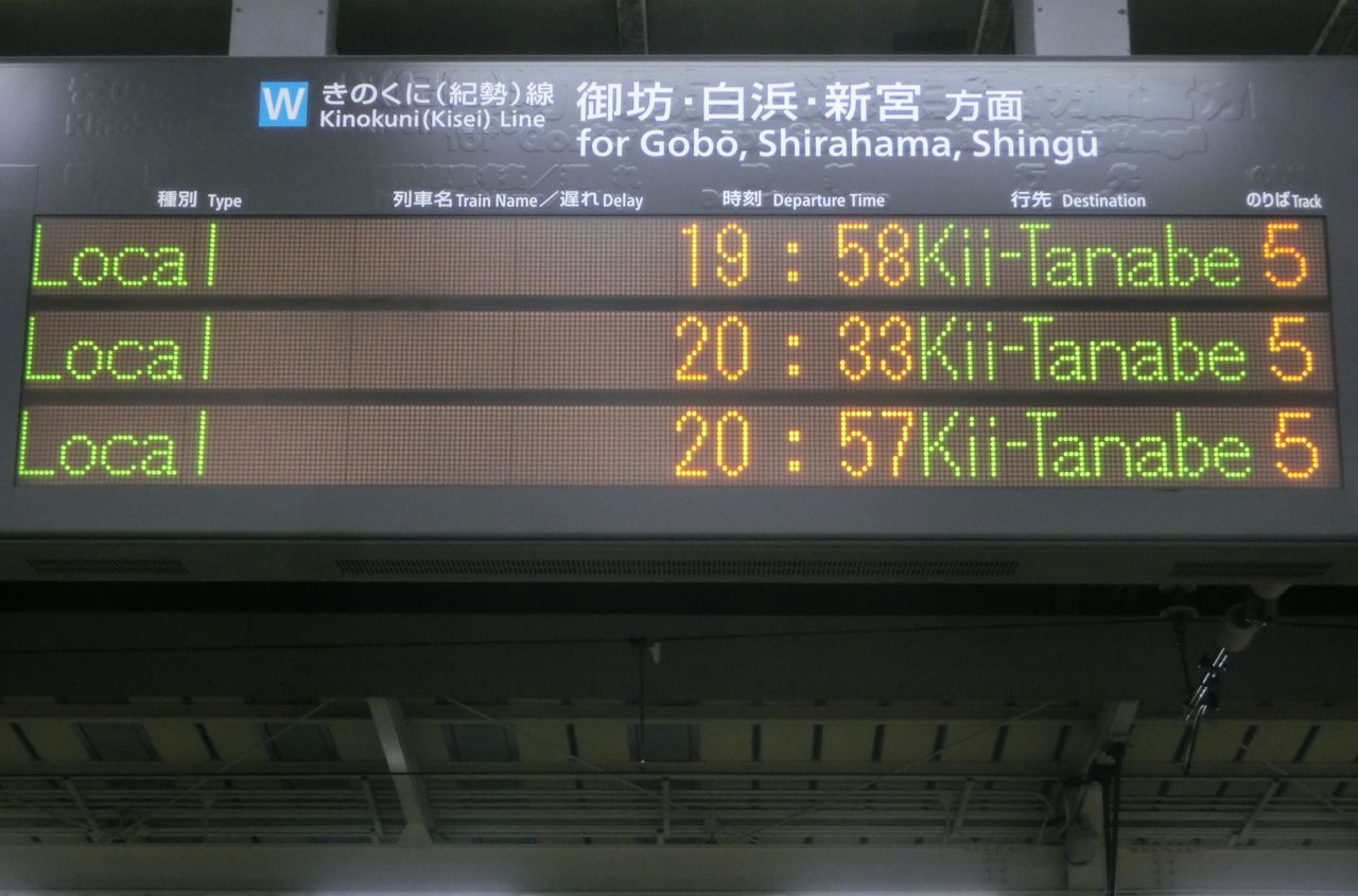 中央改札口の発車標も、この通り 紀伊田辺行きに。