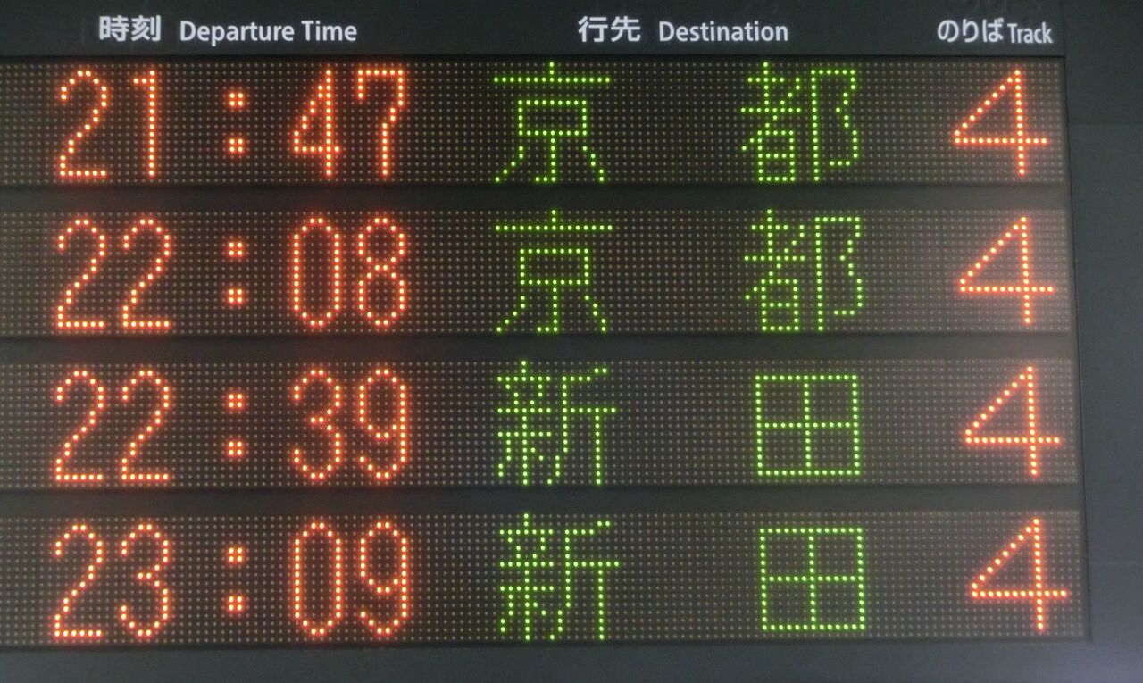 上半分に京都行き、下半分に新田行きが出ているところを撮影。