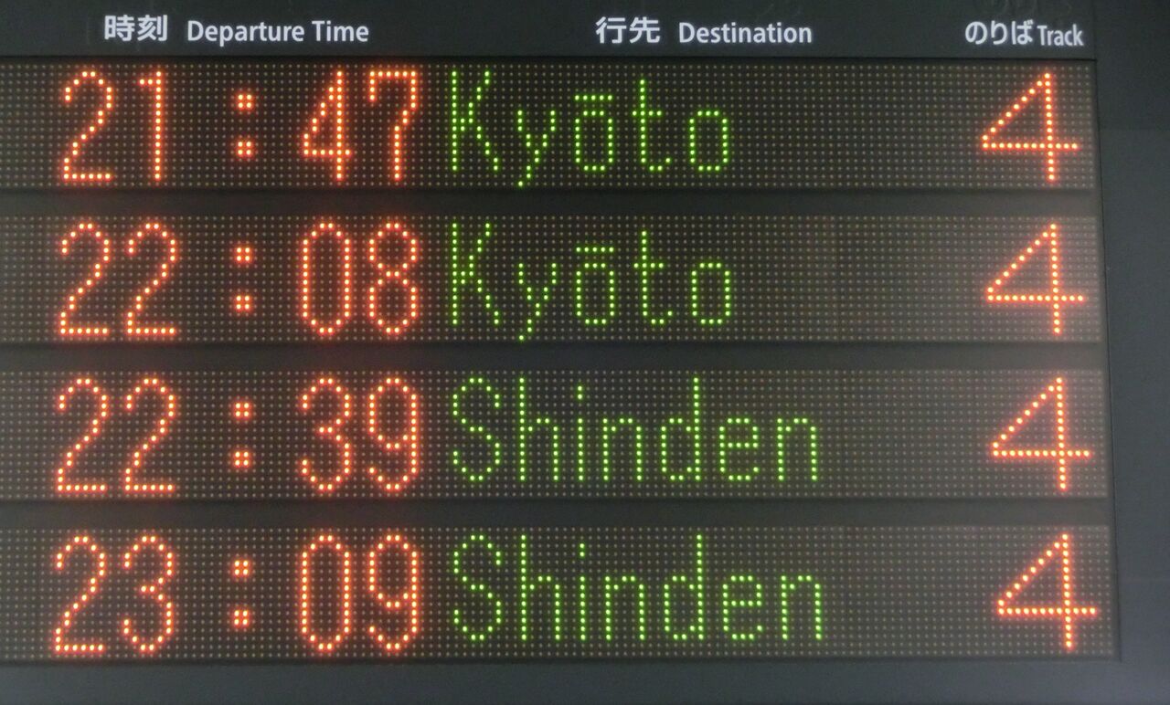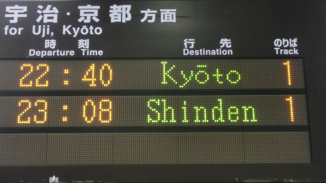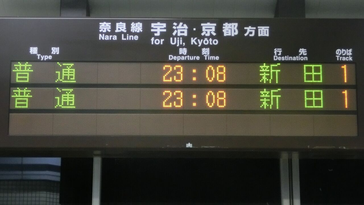 しかし、今回は 京都行きの電車が到着する前に 表示が切り替わり、23:08発の新田行きが2本表示されているところを撮ることができました。