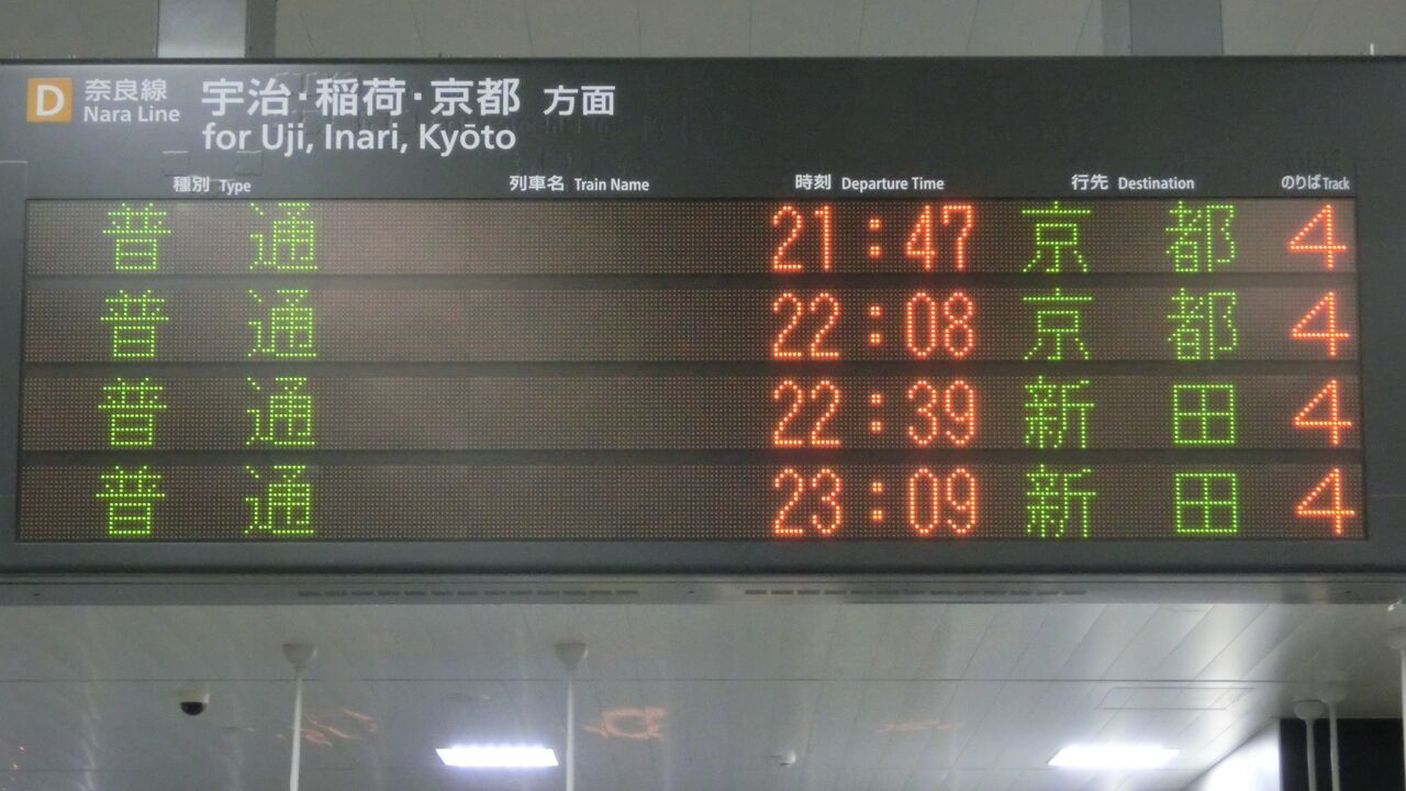 これにより、奈良22:39発と23:09発の京都行きが 「新田行き」 、京都23:09発、23:34発、23:58発の奈良行きが 「木幡行き」 として運転されました。