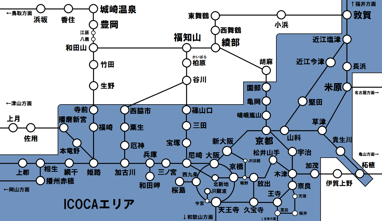 大阪への通勤路線である JR宝塚線 篠山口駅以南や、姫路に近い 播但線 寺前駅以南こそ ICOCAエリアになっていますが、京都府北部や兵庫県北部は ICカードが使えない 「空白地帯」 が広がっているのです。