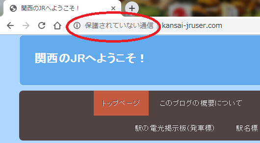 このブログ(関西のJRへようこそ!)は https化されていないので、Google Chromeで見ると、このように 「保護されていない通信」 と表示されますが・・・