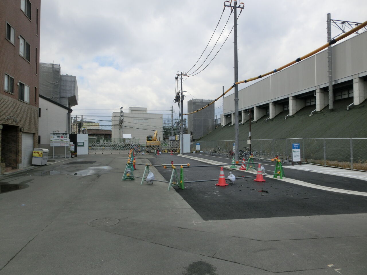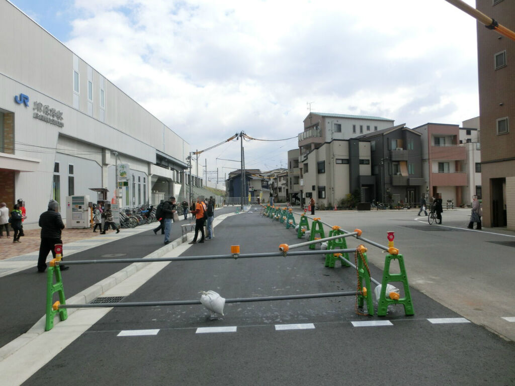 駅前の道路は広いですが、その半分ほどは単管バリケードで仕切られています。