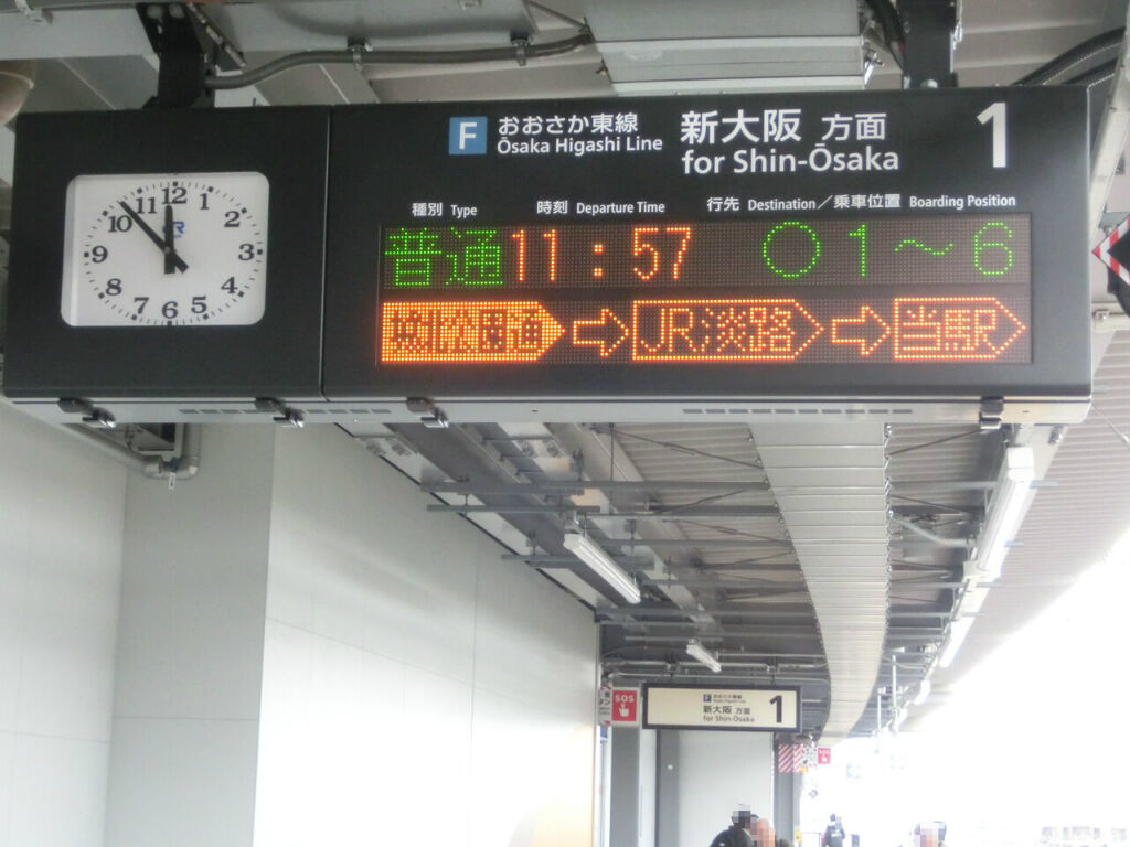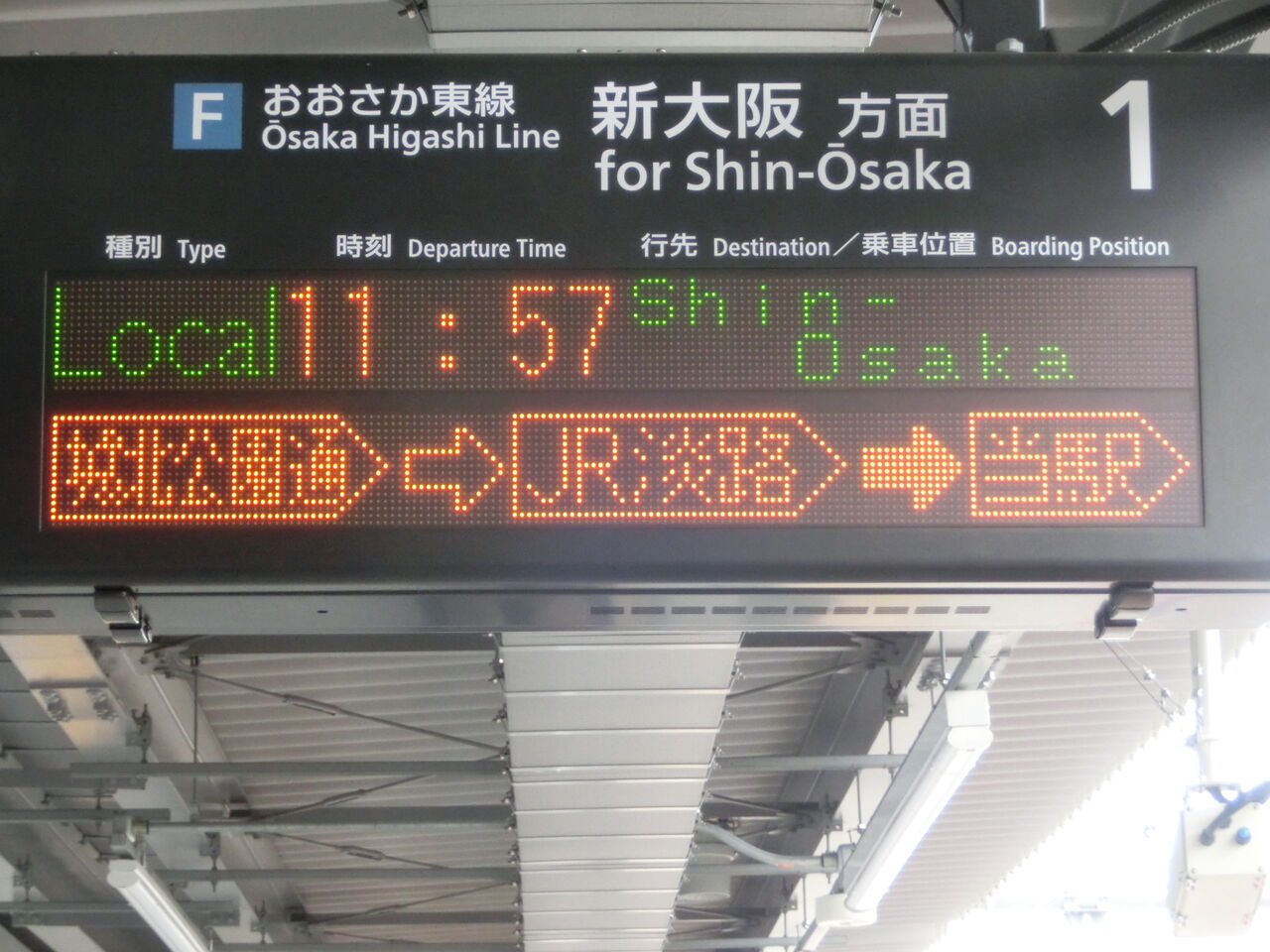 電光掲示板を拡大して撮影。 こちらは、新大阪方面の発車案内です。