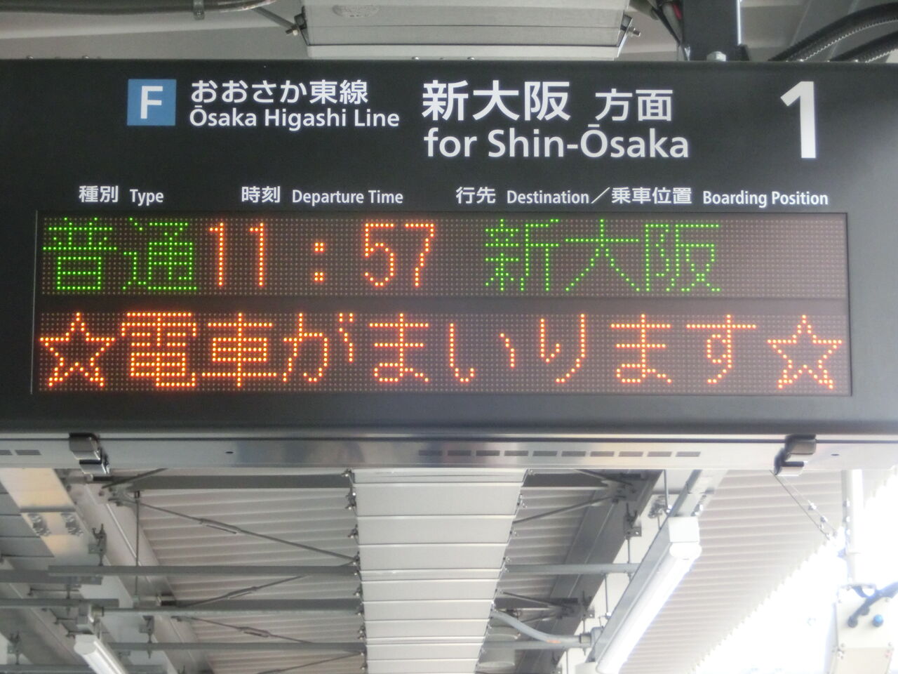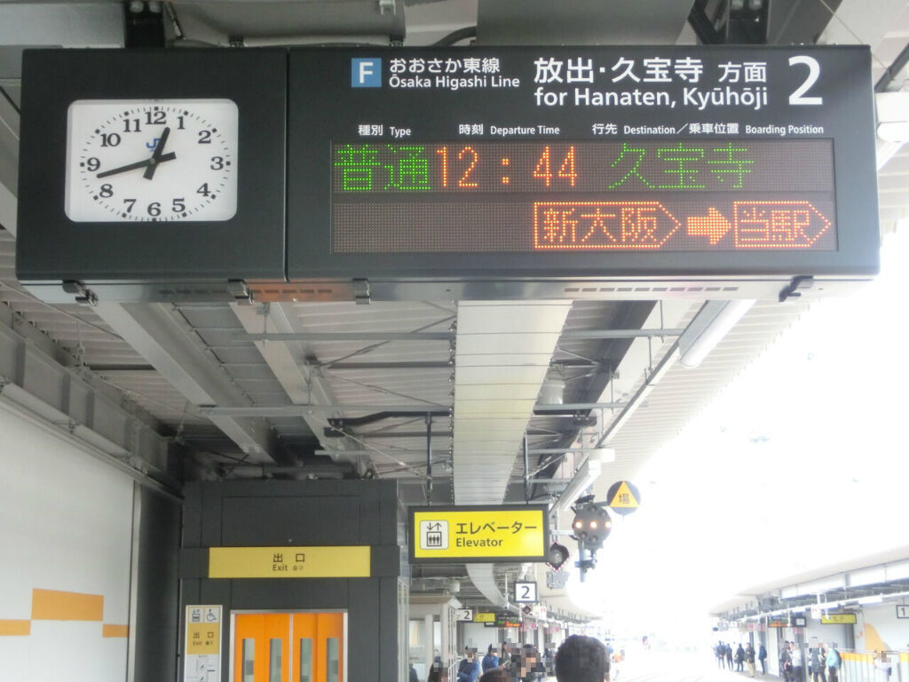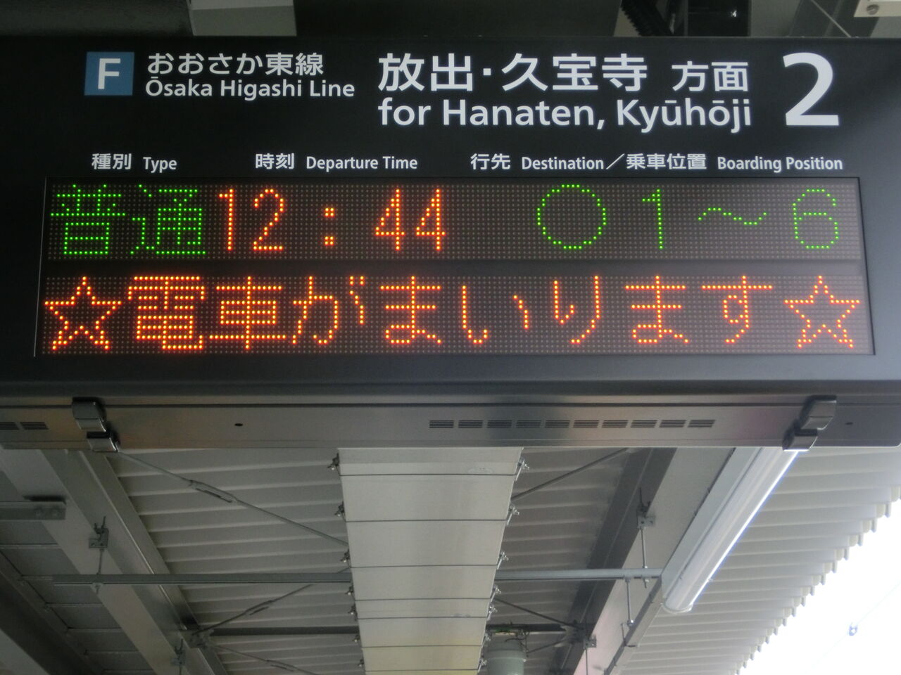 続いて、2番のりば(放出・久宝寺方面ホーム)の電光掲示板を見ていきます。