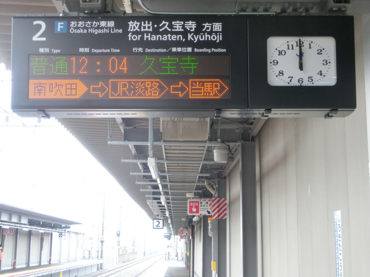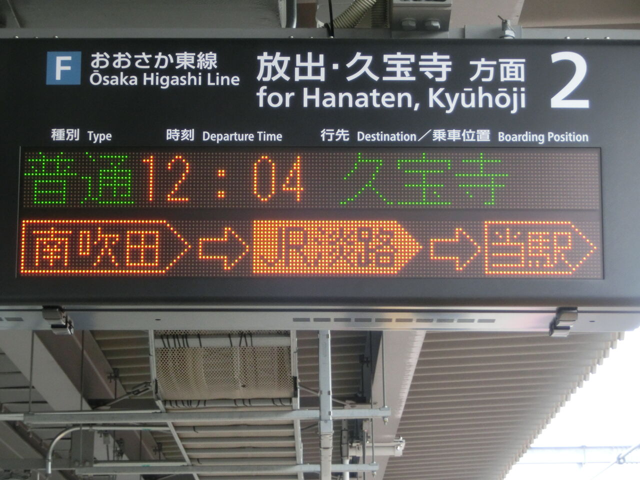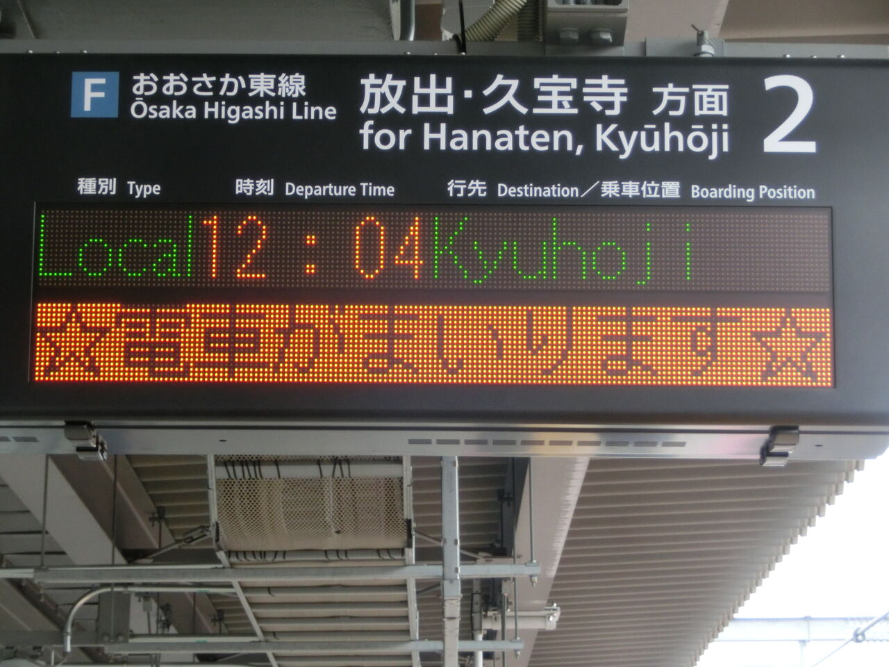 続いて、2番のりば(放出・久宝寺方面ホーム)の電光掲示板を見ていきます。