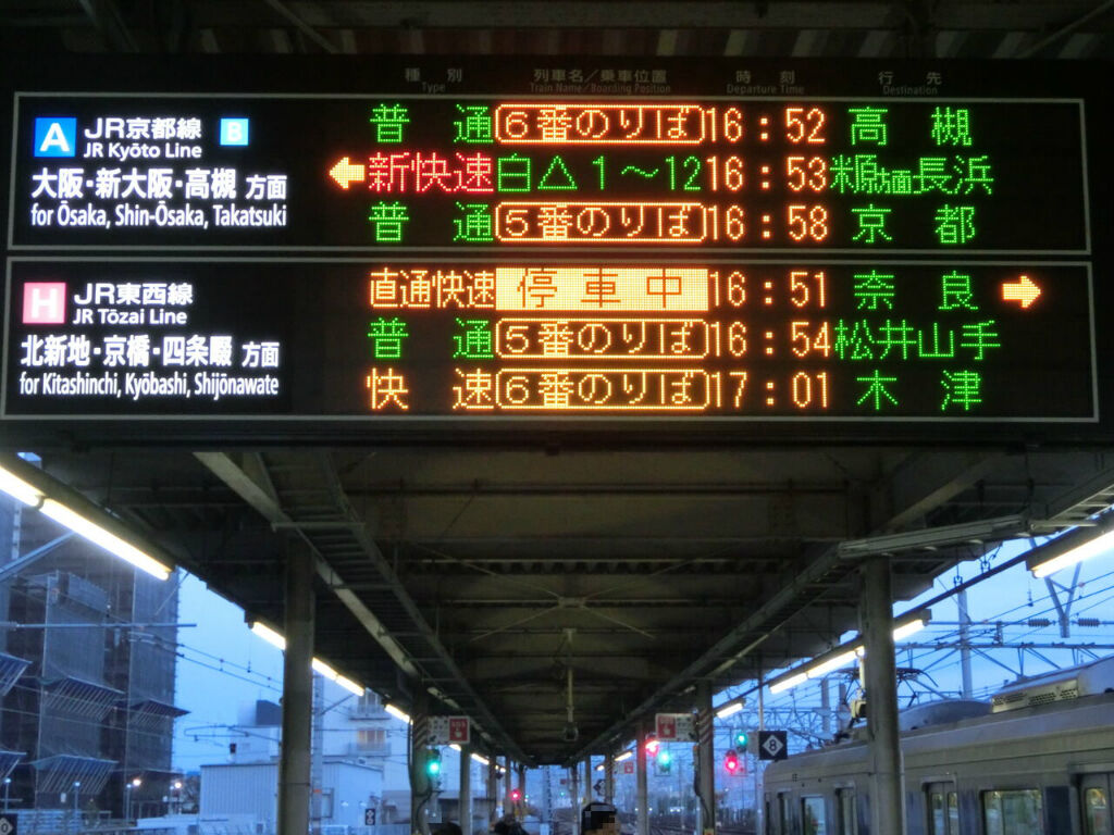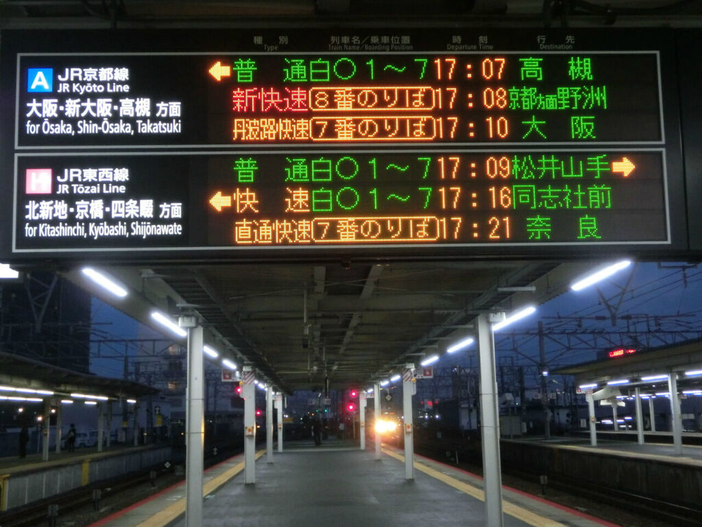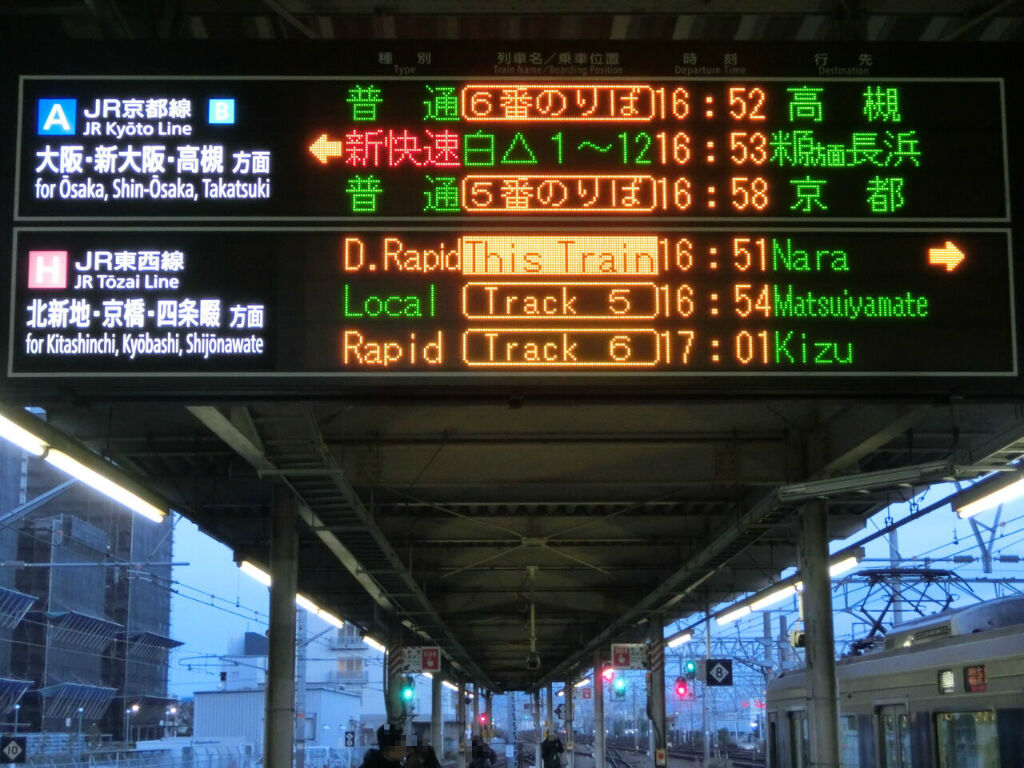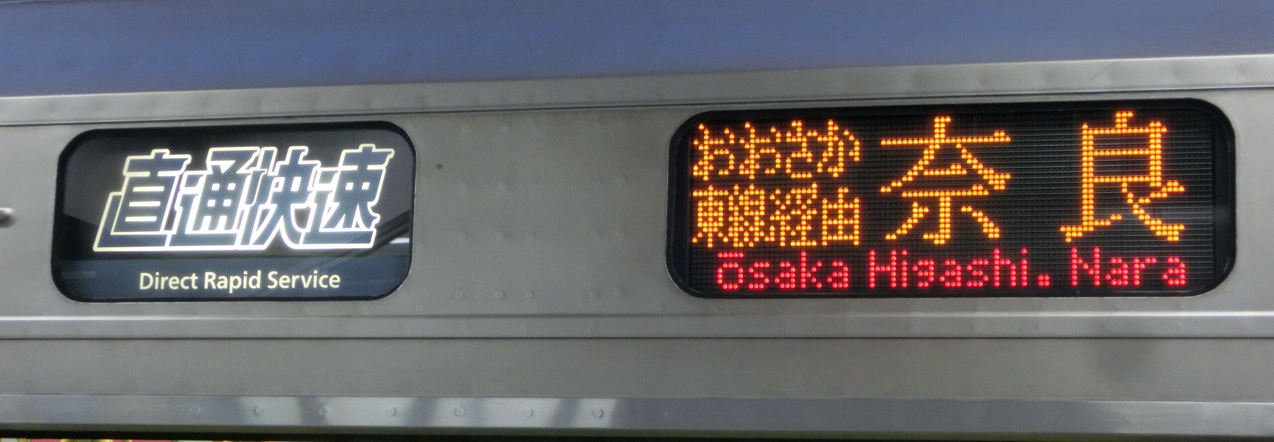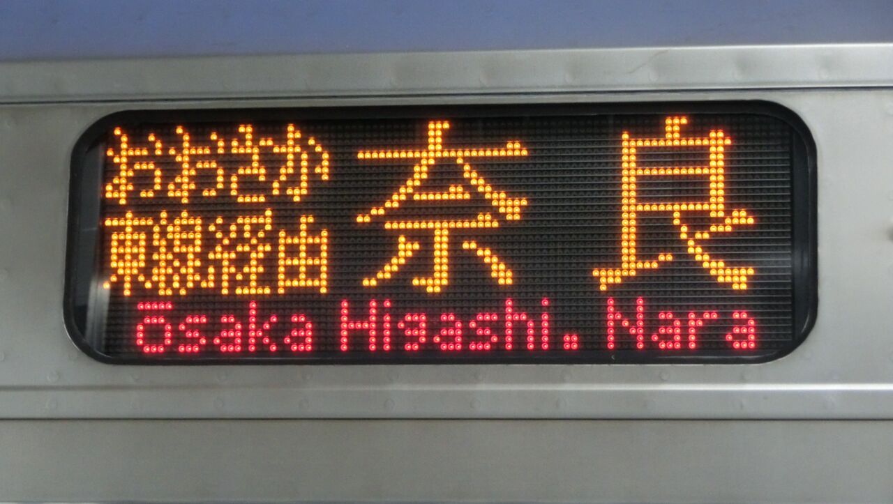 上から3段目に、直通快速 奈良行きの表示が出ています。