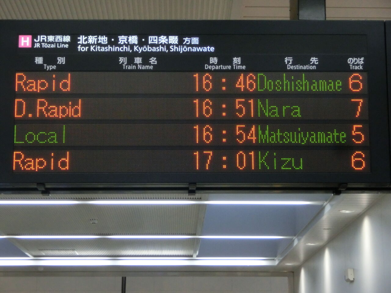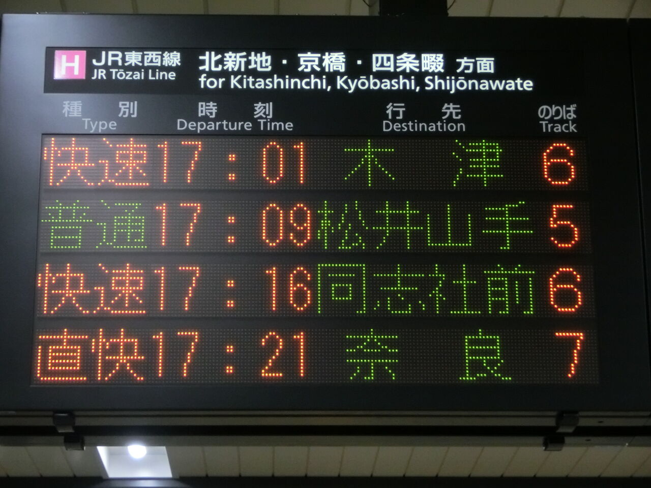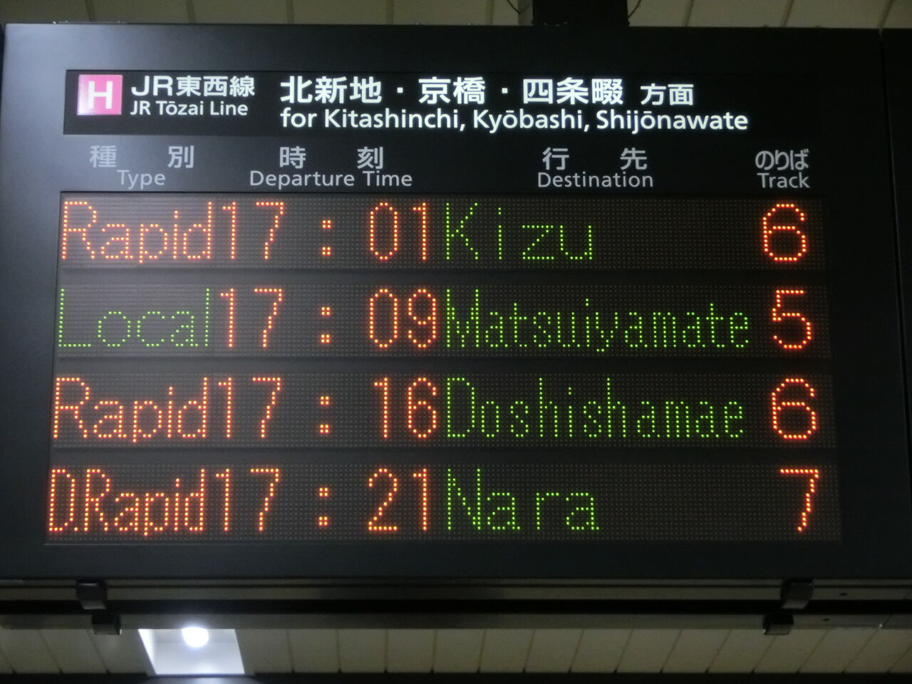 一番下の段に、直通快速 奈良行きの表示が出てました。