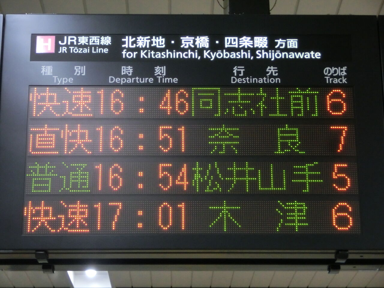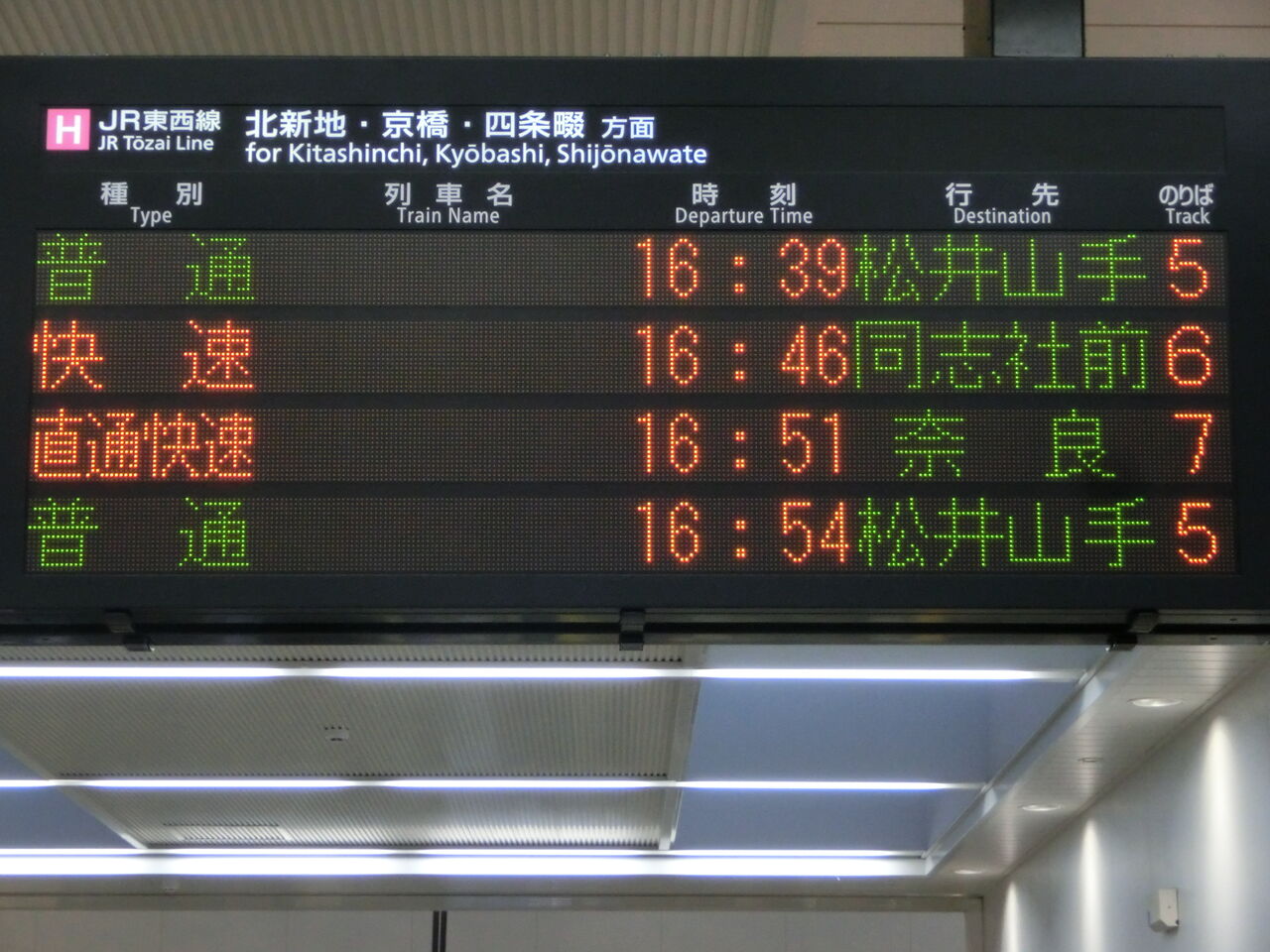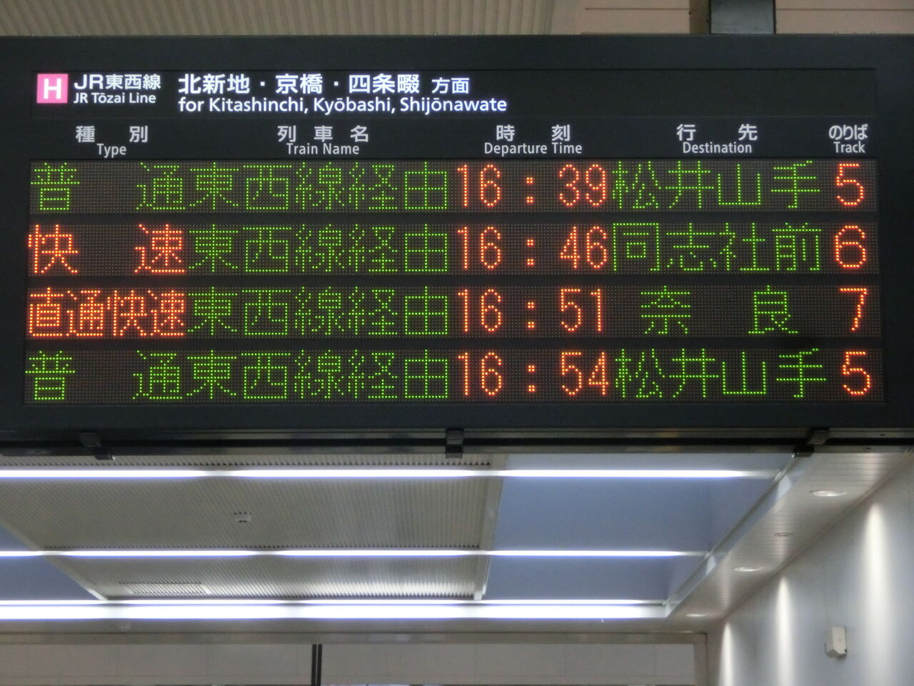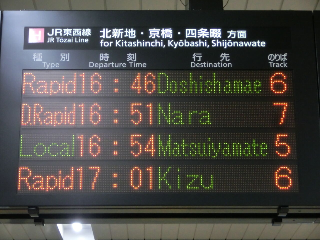 一番下の段に、直通快速 奈良行きの表示が出てました。