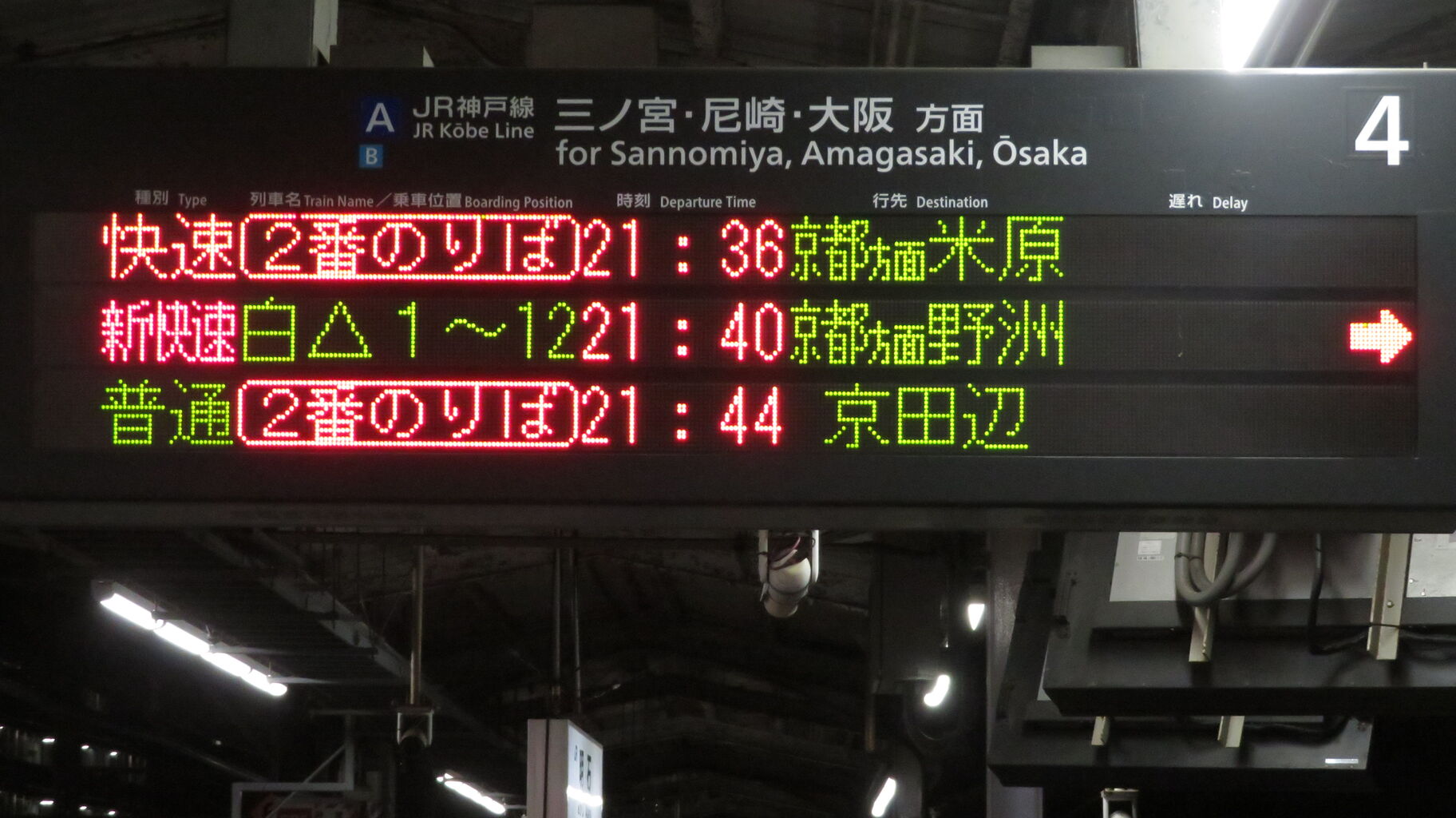 隣のホーム 4番のりばの発車標に、2番のりばから発車する普通 京田辺行きが表示されていました。
