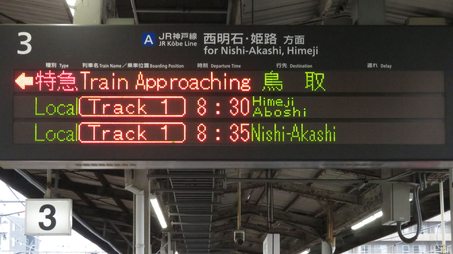 3番のりばに設置されている3色LED発車標は、こんな感じ。