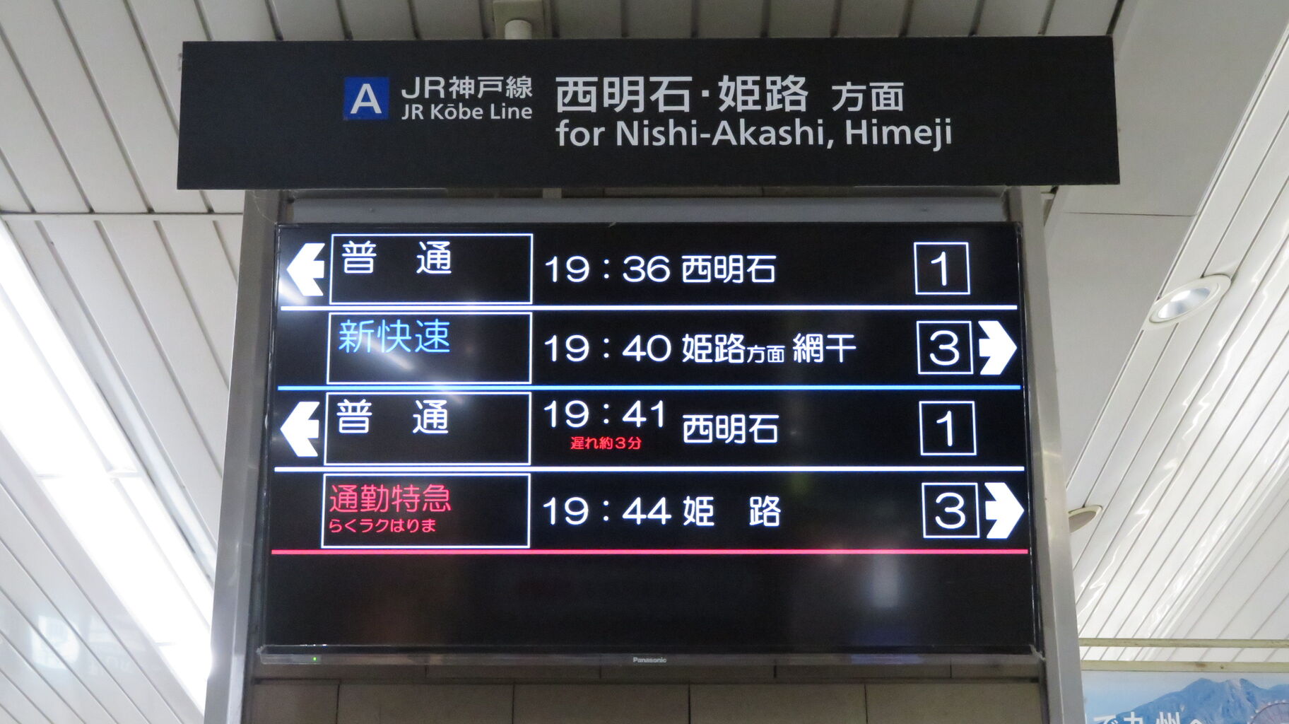 しばらくすると、3番のりばの発車案内に 通勤特急 らくラクはりまの表示が出ました!