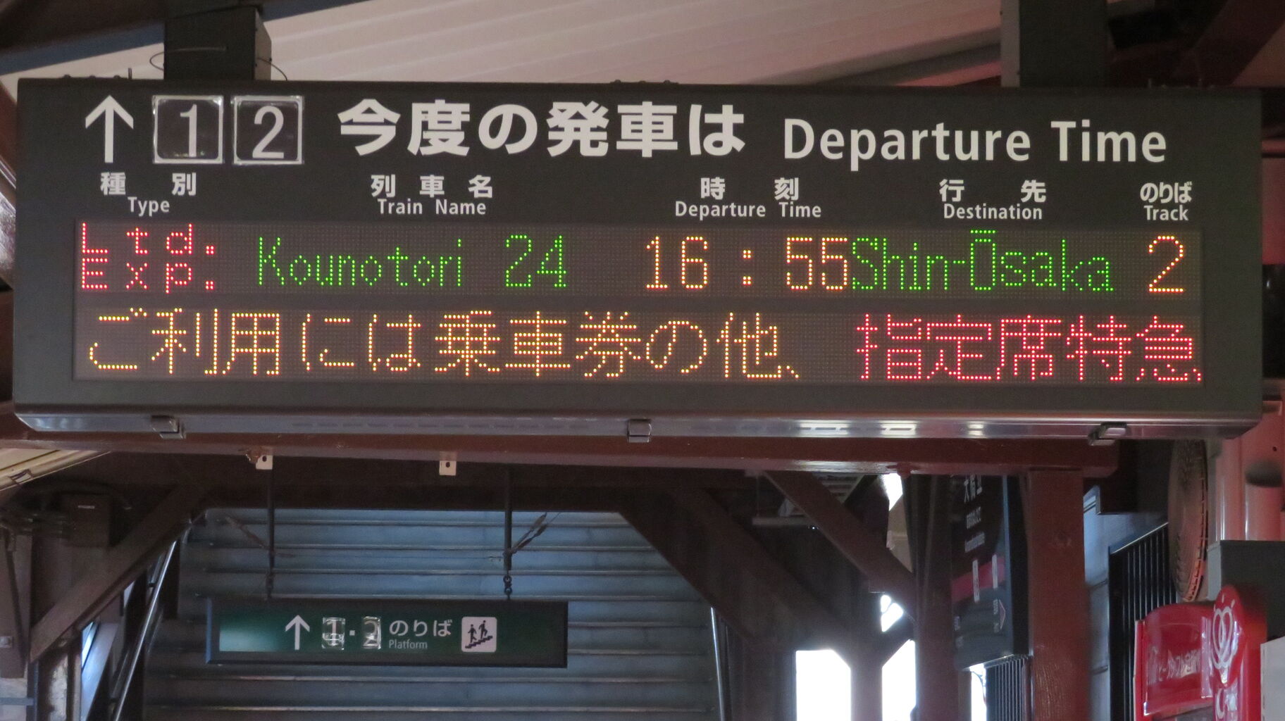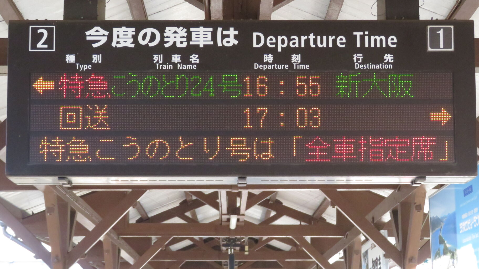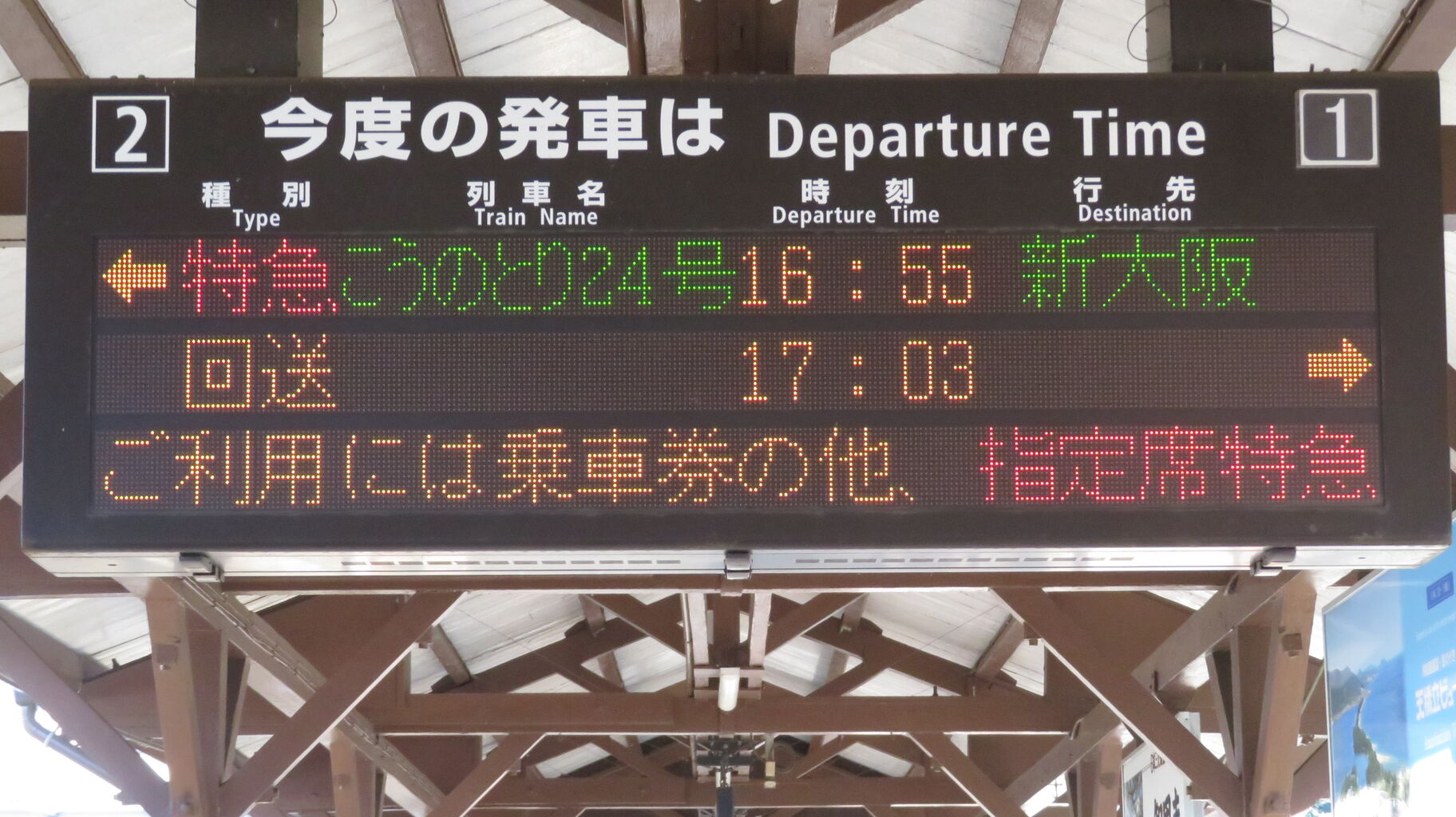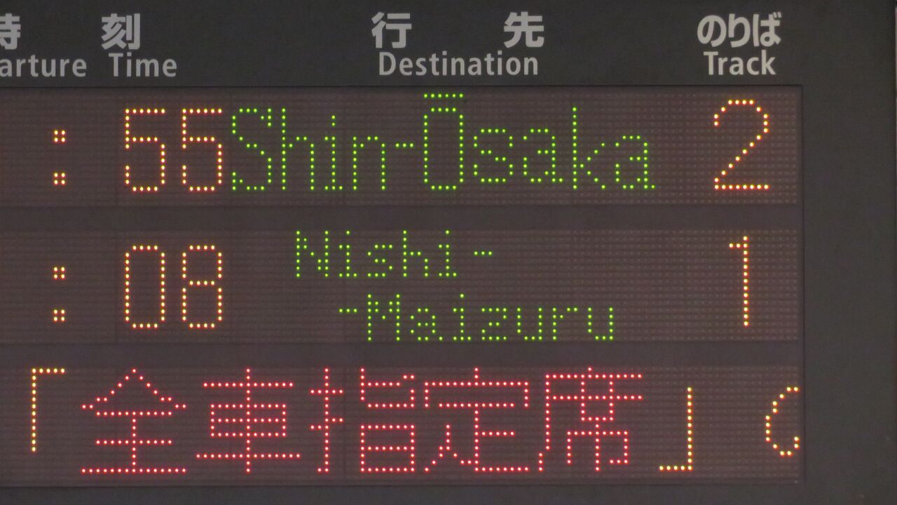 一番下の段には、『特急こうのとり号は 「全車指定席」 の特急列車です。ご利用には乗車券の他、指定席特急券が必要です。』 とスクロール表示が流れ続けていました。