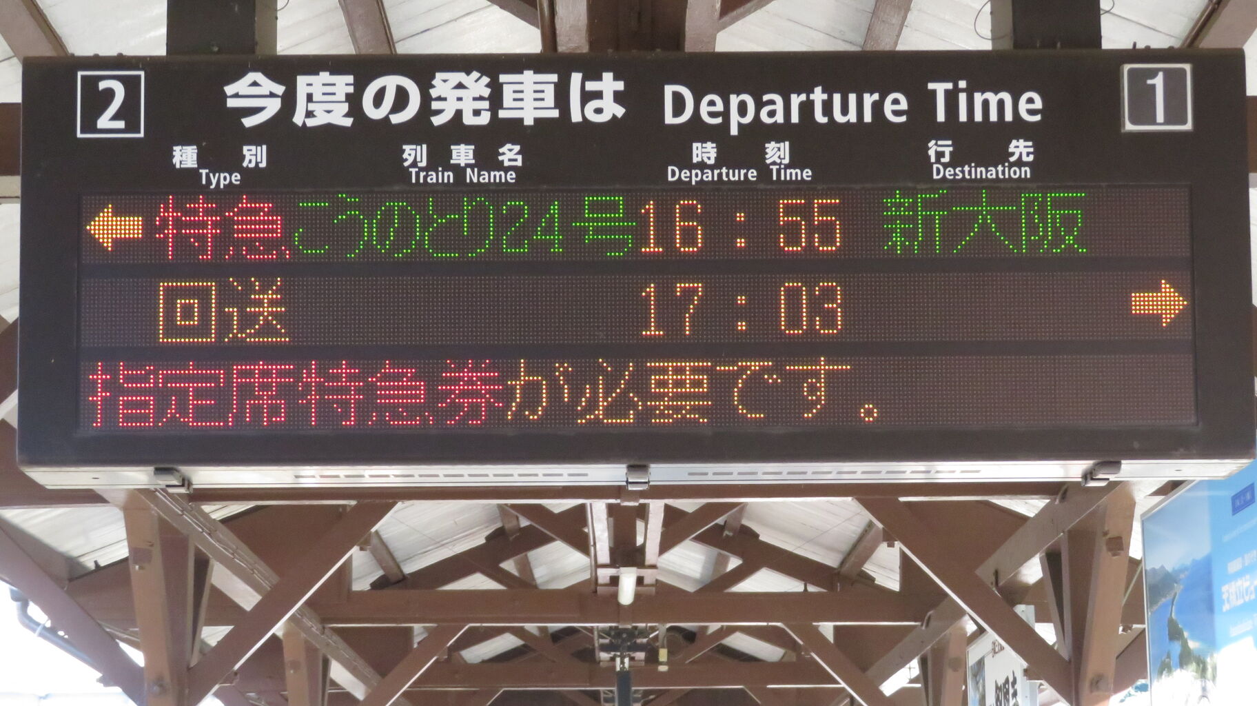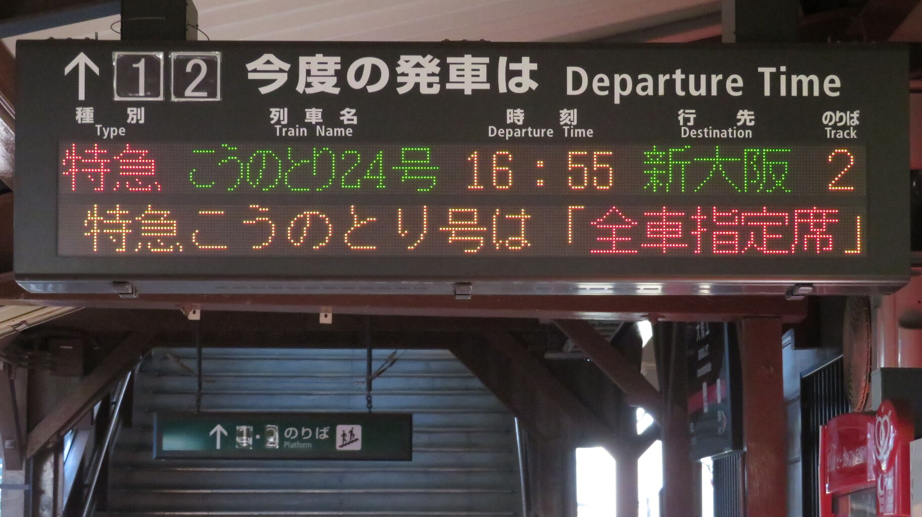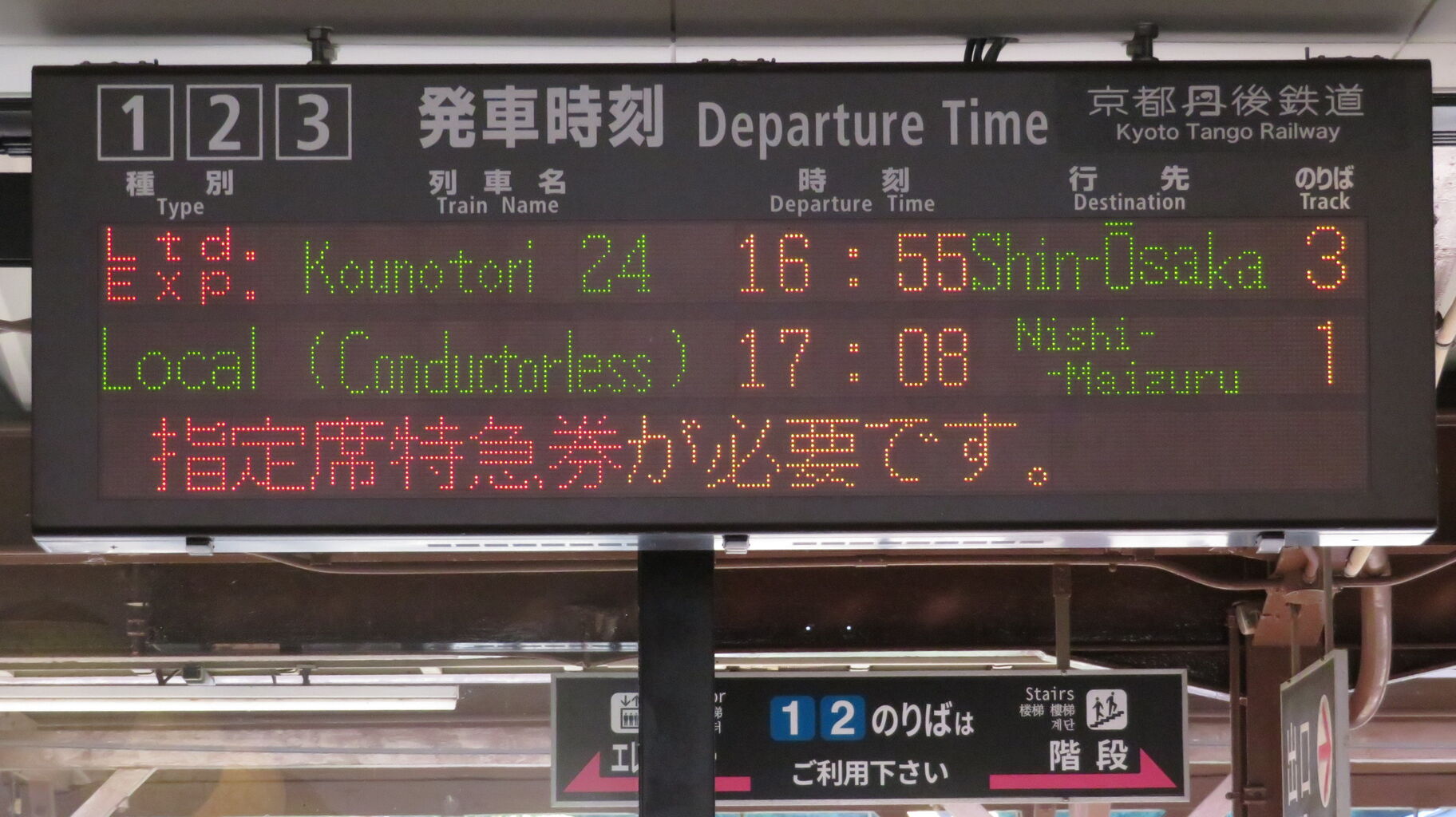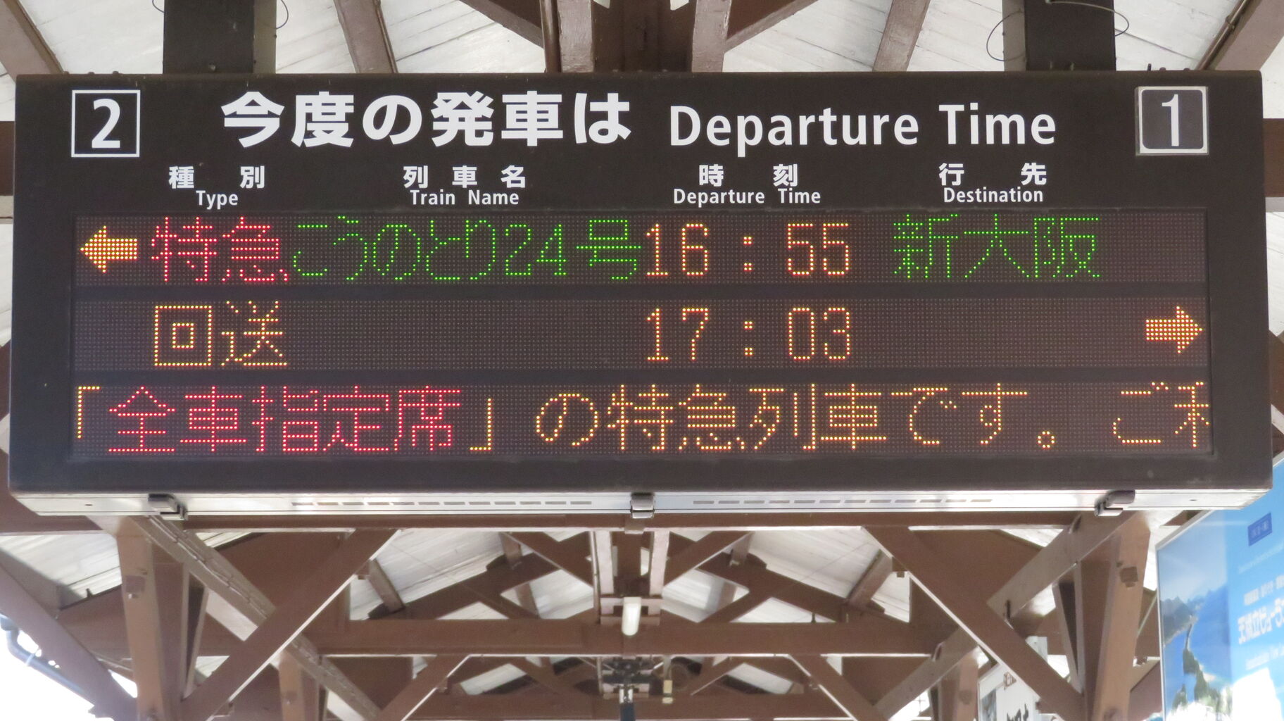 一番下の段には、『特急こうのとり号は 「全車指定席」 の特急列車です。ご利用には乗車券の他、指定席特急券が必要です。』 とスクロール表示が流れ続けていました。