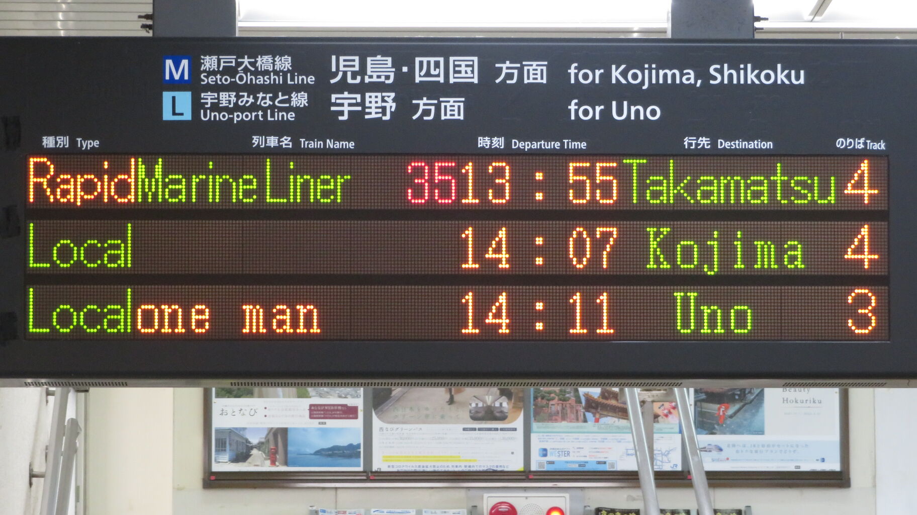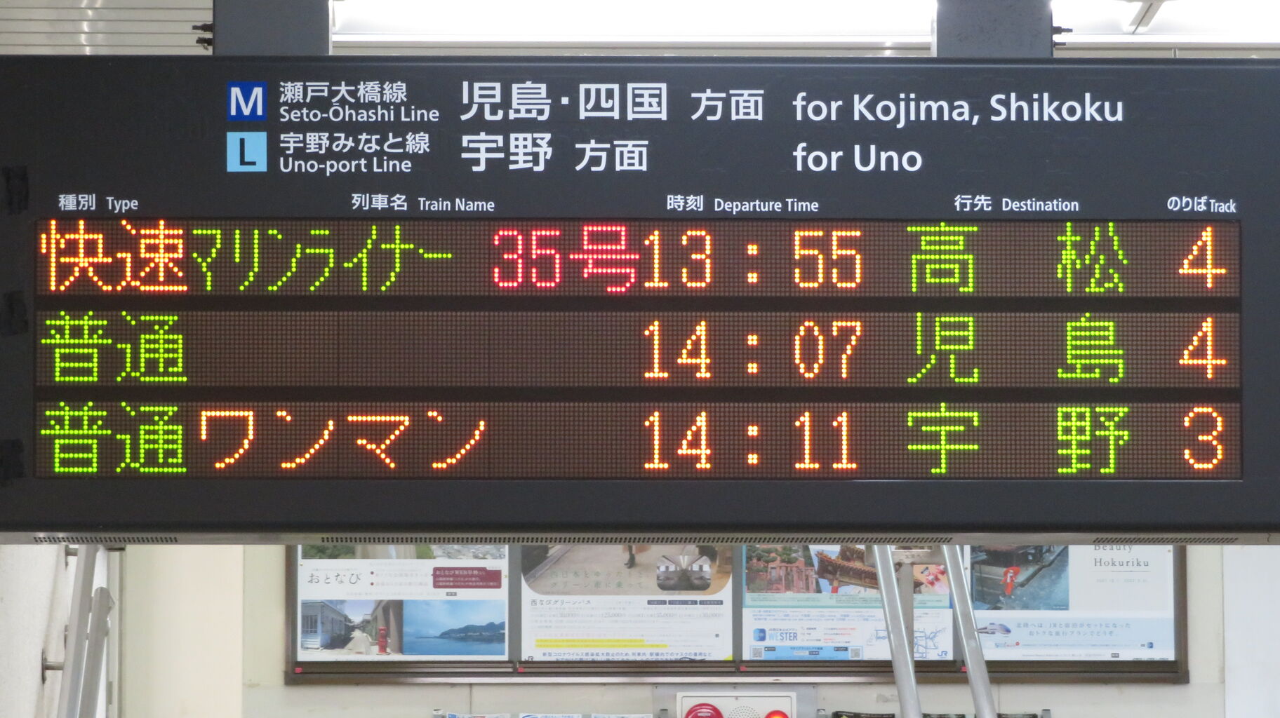 2・3番のりばから発車する列車は ほとんどが宇野行きですが、1日に4本のみ 岡山行きが発車します。
