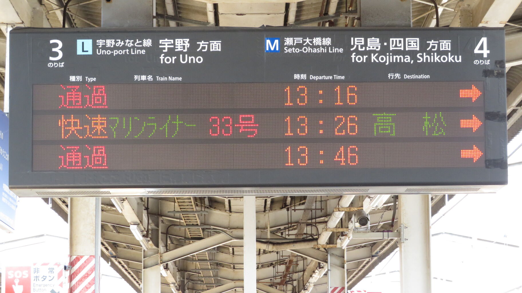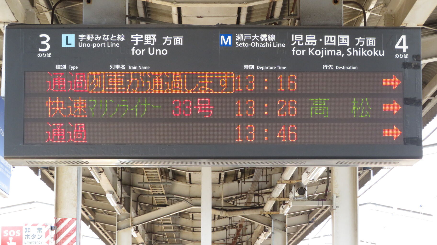 前述の通り 2番のりばと3番のりばは同じ線路ですが、こちらの発車標には 快速 岡山行きの表示が出ませんでした。