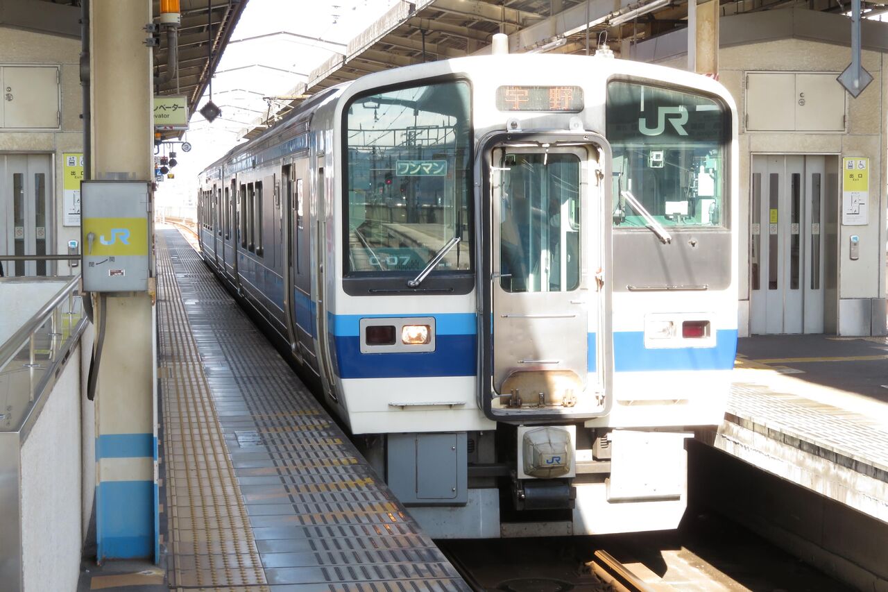 2つのホームに挟まれた線路(2・3番のりば)に、普通 宇野行きが停車しています。