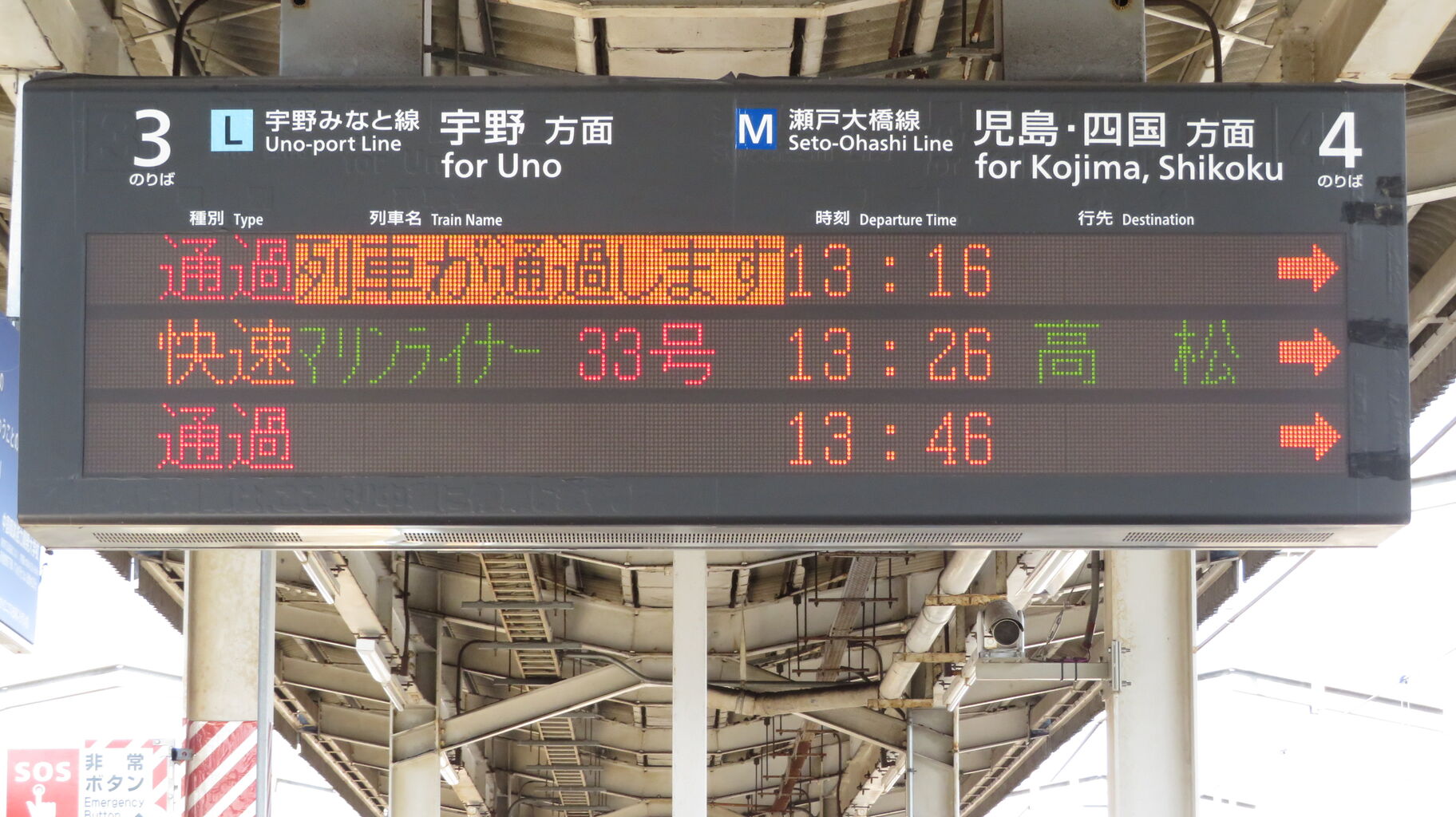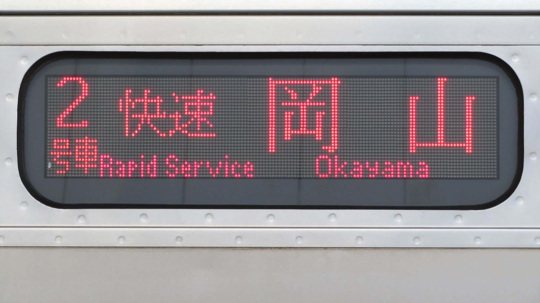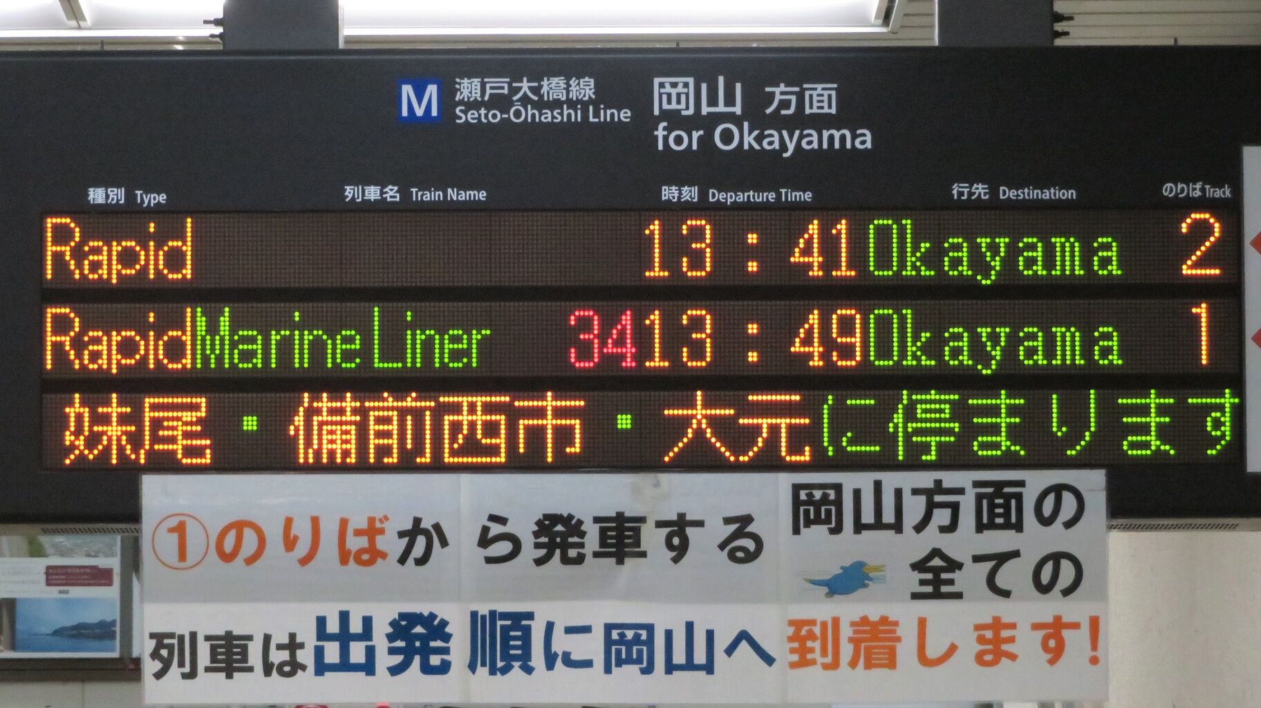 一番下の段には、「快速岡山行きは途中、妹尾・備前西市・大元に停まります。」 とスクロール表示が流れます。