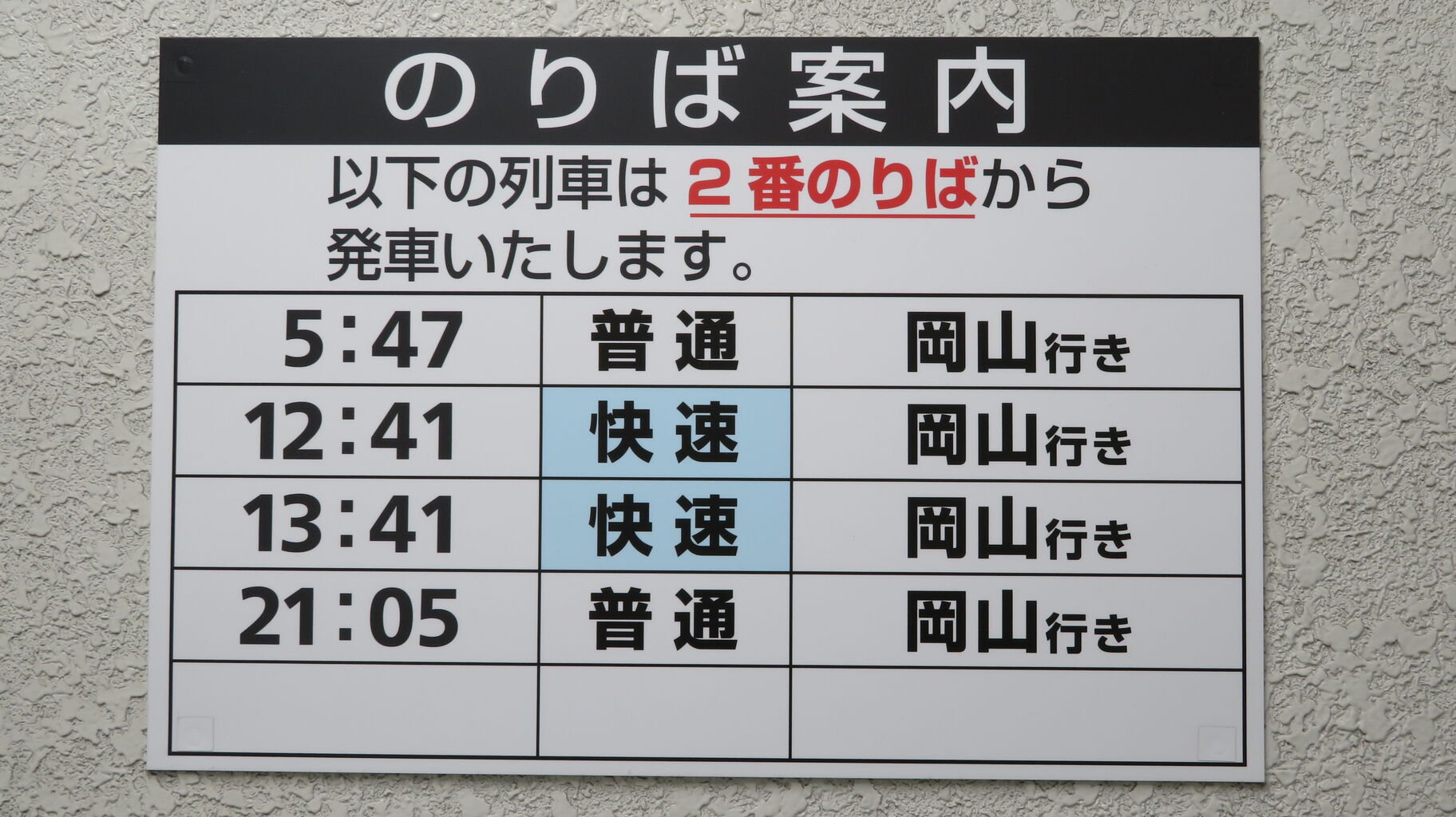 岡山方面へ向かう列車は 1番のりばから発車することが多いですが、快速 岡山行きは 2番のりばから発車します。