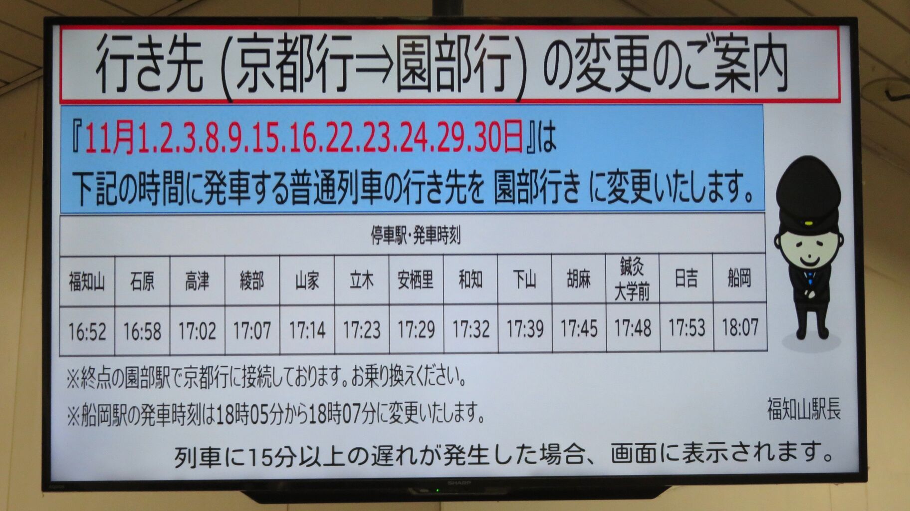 通常では京都行きのところ、11月の土休日に限り、園部行きに変更して運転されたためです。