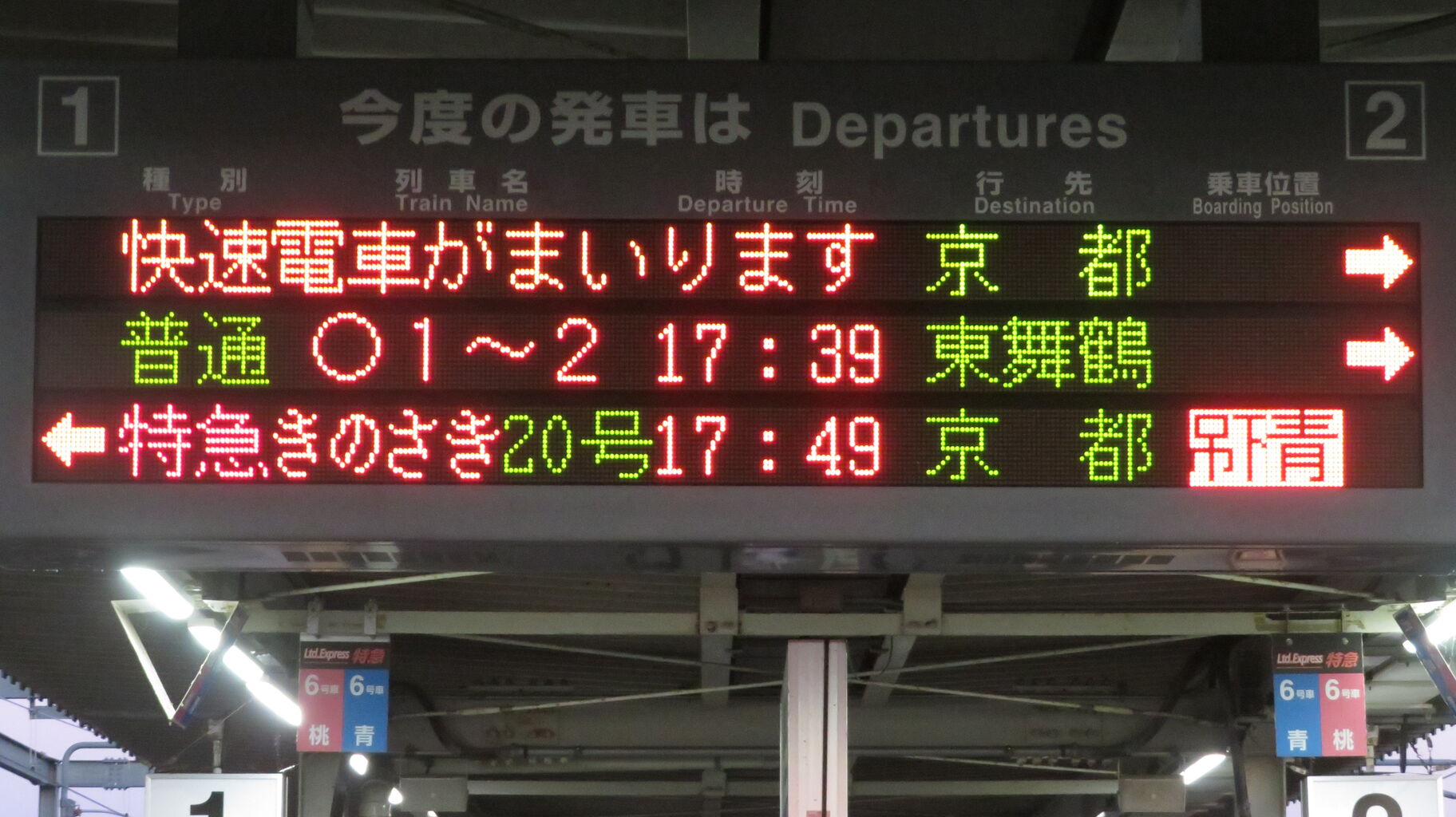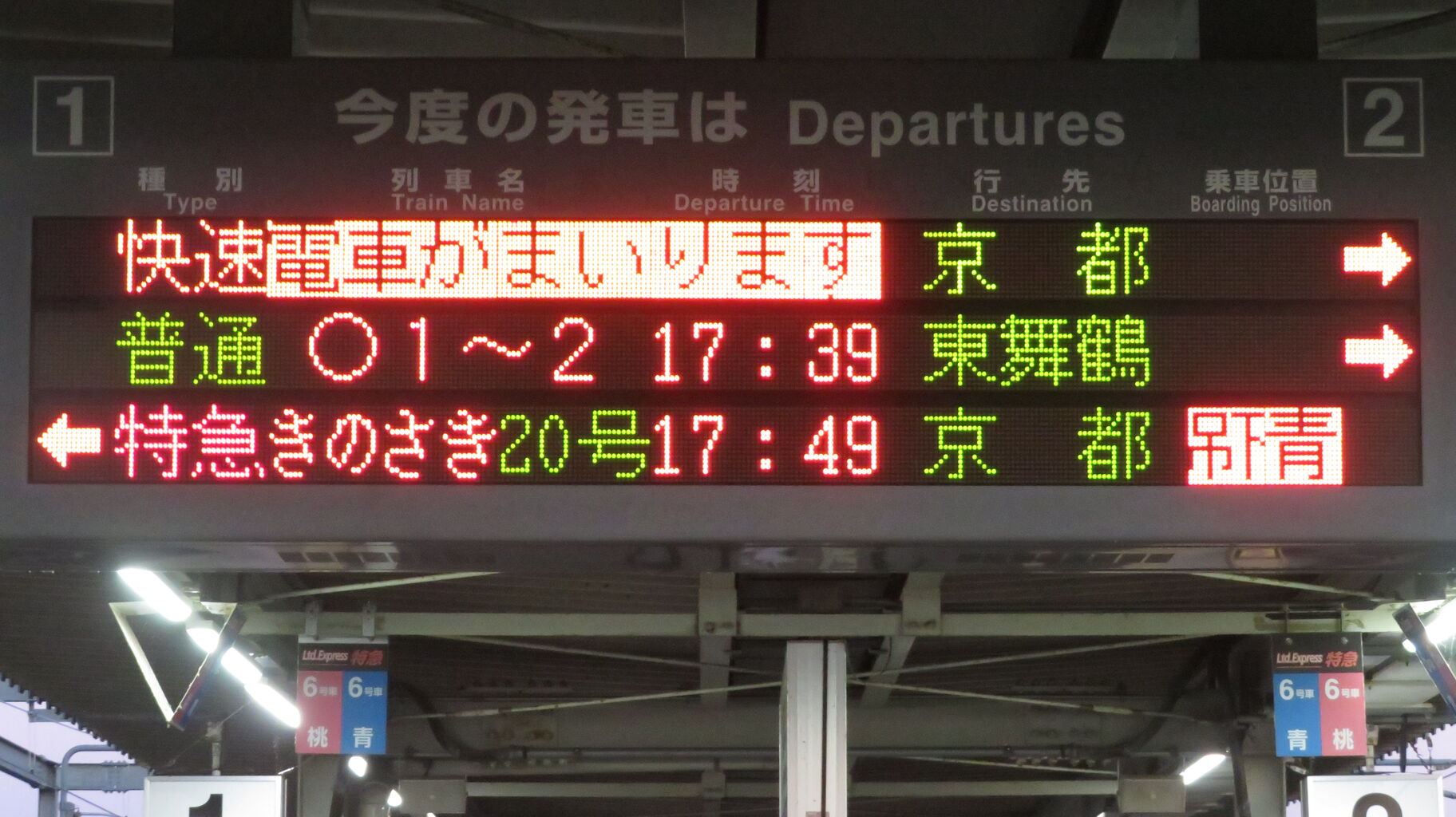 一番下の段には、特急きのさき20号 京都行きが表示されています。