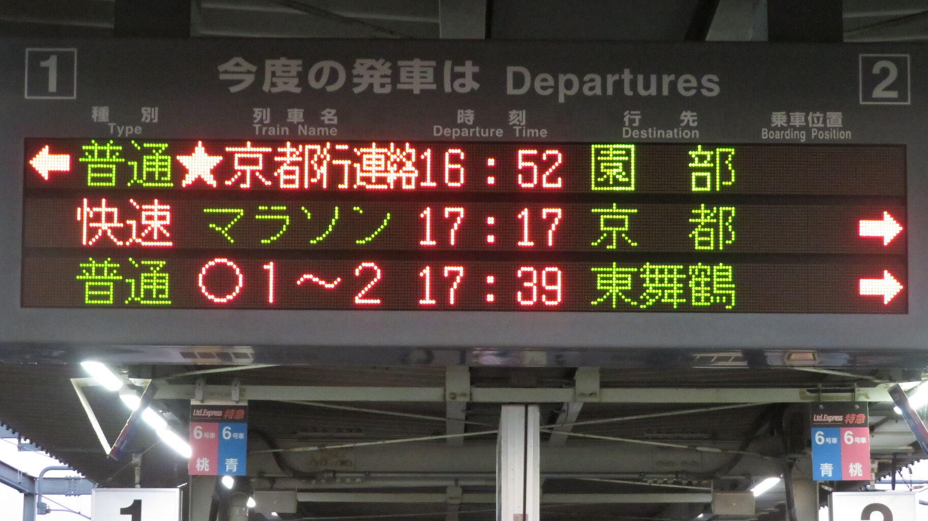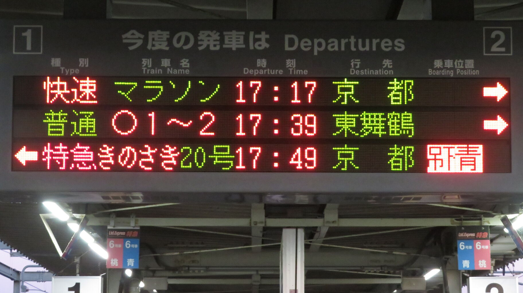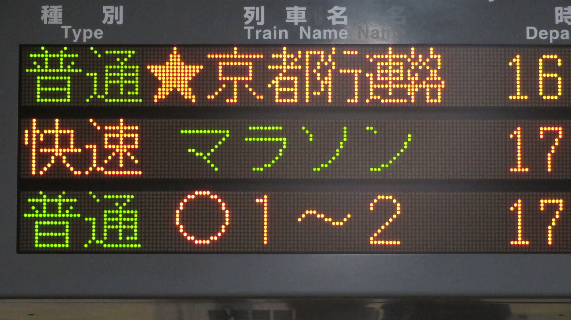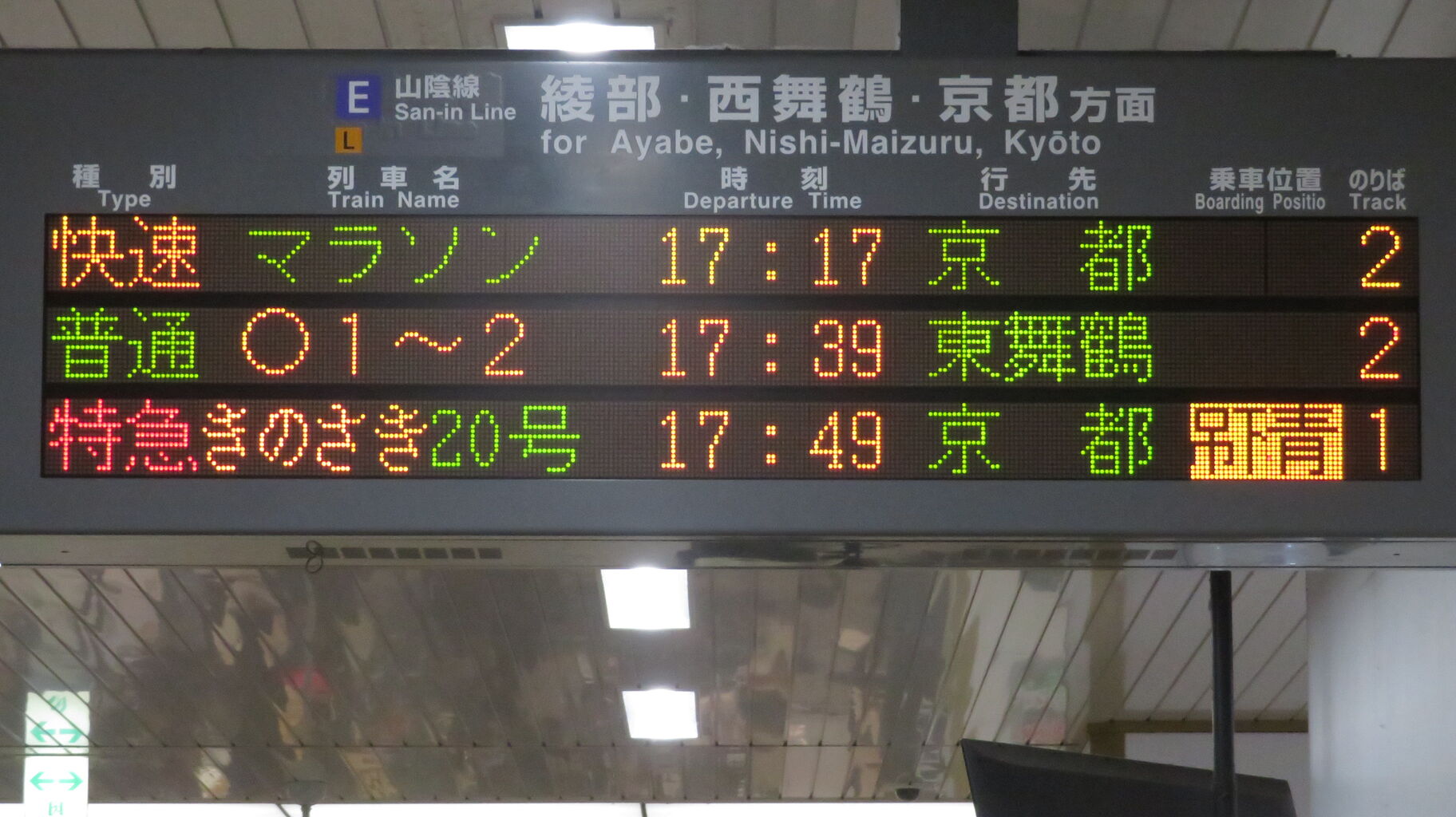 福知山駅の発車標に 福知山マラソン号の列車名表示が用意されていることも驚きですが、日本語・英語共に省略表示だとは思いもしませんでした。