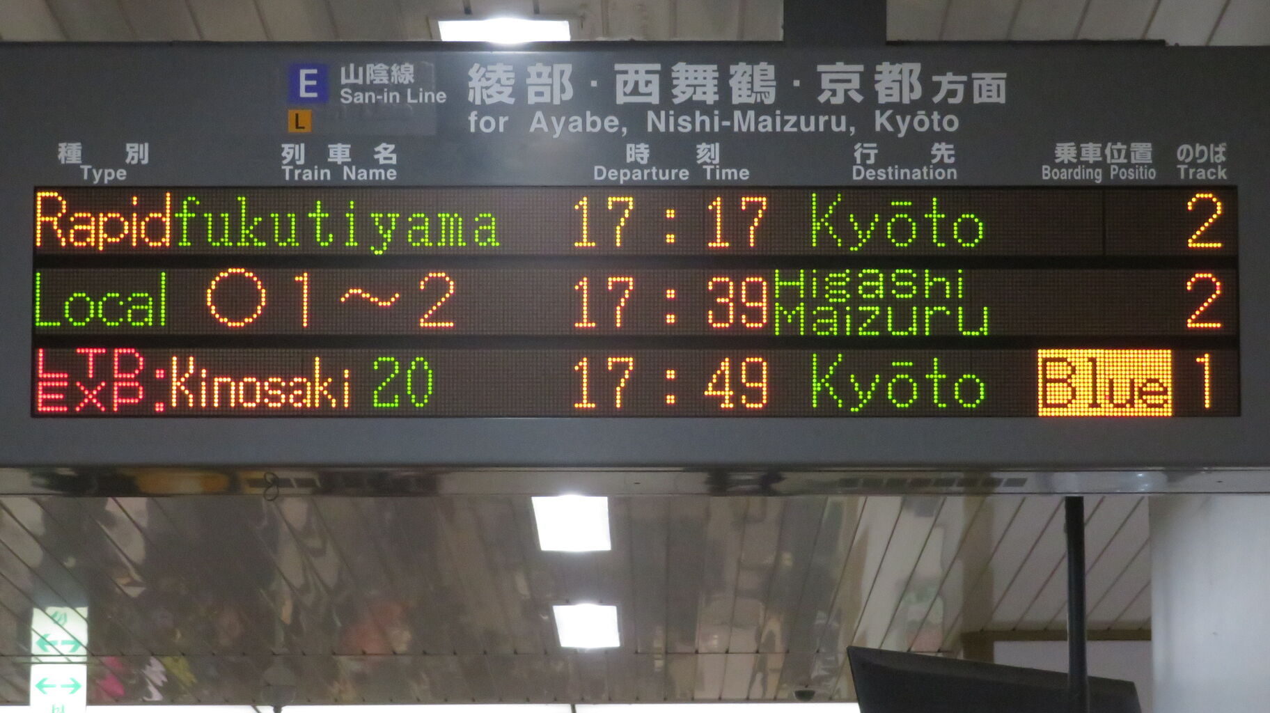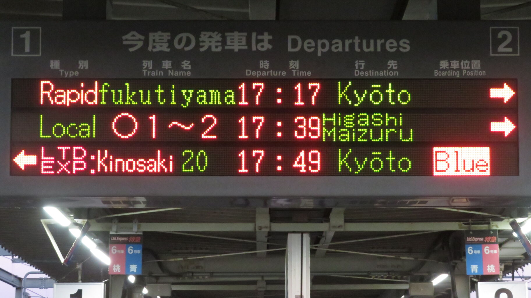 これは、福知山駅の発車標に乗車位置が表示されるようになる前は、終日にわたって日常的に見られた表示です。